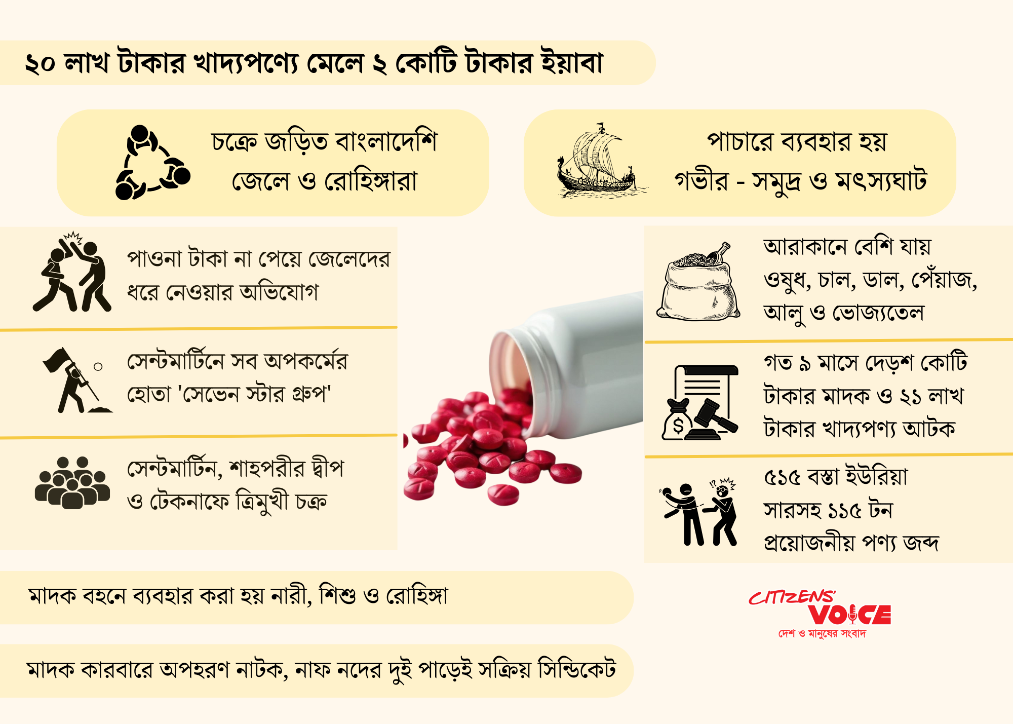রাখাইনের নিয়ন্ত্রণ নেওয়া বিদ্রোহী গোষ্ঠী আরাকান আর্মির খাদ্য–ওষুধ নির্ভরতার সুযোগে গড়ে উঠেছে এই প্রতিদিন রাতেই সক্রিয় থাকা ‘বাংলা মাল’ চক্র। রাতের গভীরে বাংলাদেশি পণ্য সমুদ্রপথে যায় রাখাইনে, আর ভোরের আগে ফিরে আসে ইয়াবা ও আইসে ভরা ট্রলার। নারী, শিশু ও রোহিঙ্গাদের ব্যবহার করা হয় বহন ও খালাসে। আটক এড়াতে সাজানো হয় ‘অপহরণ নাটক’ও।