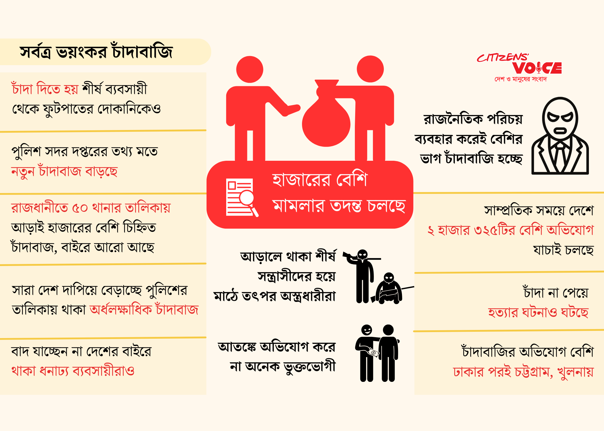 দেশজুড়ে চাঁদাবাজির কারণে নিরাপত্তাহীনতায় ভোগছেন ব্যবসায়ী প্রতিষ্ঠান মালিকসহ বিভিন্ন পেশার মানুষ। সাধারণ মানুষও এর তীব্র প্রভাব অনুভব করছেন। গত কয়েক মাসে সারা দেশে দুই হাজার ৩২৫টির বেশি চাঁদাবাজির অভিযোগ যাচাই করেছে আইন-শৃঙ্খলা রক্ষা বাহিনী। সূত্র জানিয়েছে, ‘বেশির ভাগ ঘটনায় স্থানীয় রাজনৈতিক পরিচয়ধারী ব্যক্তি বা সংগঠনের যোগসাজশ রয়েছে।’