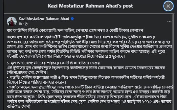 - সম্প্রতি বাংলাদেশ বার কাউন্সিল আইনজীবী তালিকাভুক্তি পরীক্ষা ঘিরে ব্যাপক অনিয়ম, দুর্নীতি ও ক্ষমতার অপব্যবহার নিয়ে লিখেছেন কাজী মোস্তাফিজুর রহমান আহাদ। সুত্র: লেখকের ফেসবুক থেকে সংগৃহীত।