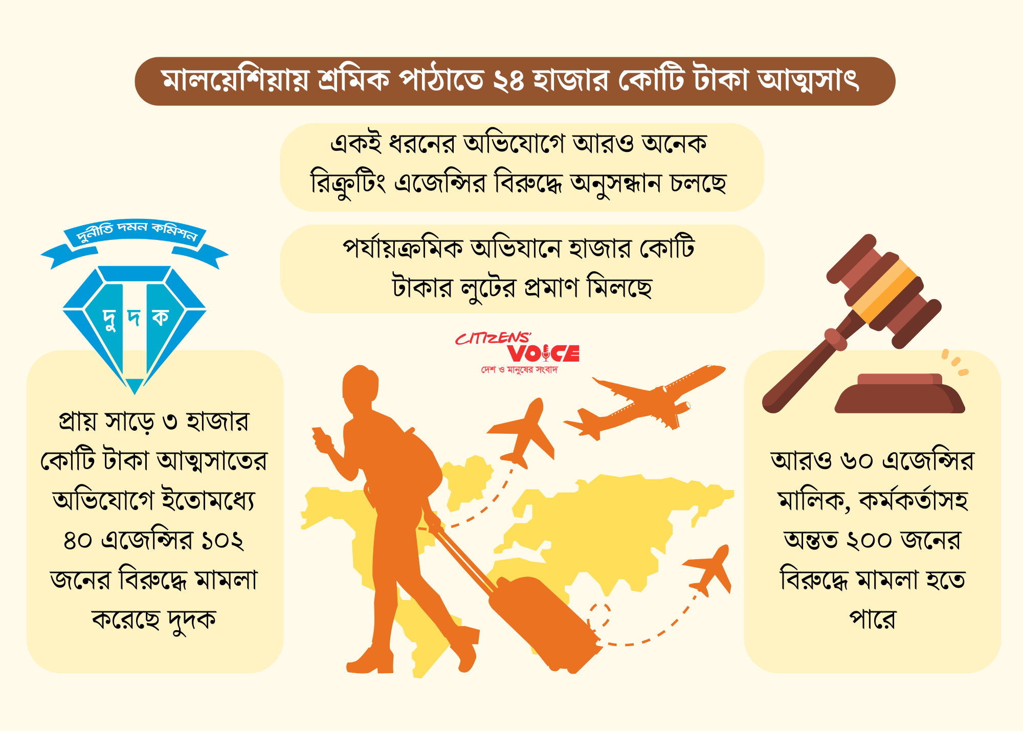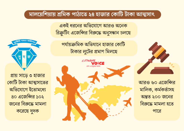 বাংলাদেশ থেকে মালয়েশিয়ায় শ্রমিক পাঠানোর নামে অন্তত ২৪ হাজার কোটি টাকা আত্মসাতের অভিযোগে বড় ধরনের ঝুঁকিতে পড়েছেন ১০০ রিক্রুটিং অ্যাজেন্সির মালিকসহ সংশ্লিষ্ট তিন শতাধিক ব্যক্তি। দুর্নীতি দমন কমিশনের (দুদক) মামলায় তাদের বিরুদ্ধে একের পর এক প্রমাণ মিলছে।