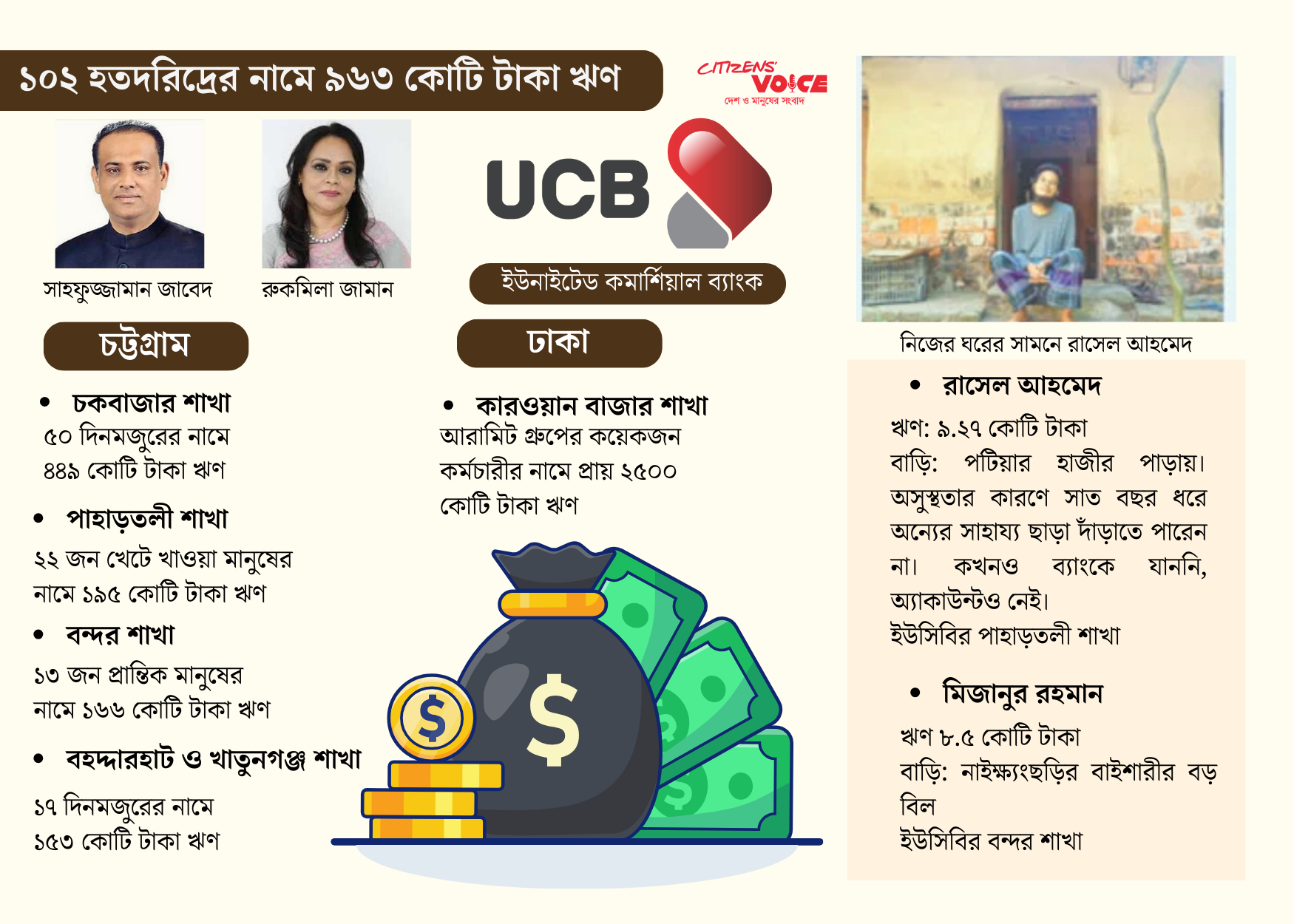 চট্টগ্রামের ১০২ জন দিনমজুর, ভ্যানচালক ও কৃষকের নামে কোটি কোটি টাকার ঋণ নেওয়া হয়েছে। ইউনাইটেড কমার্শিয়াল ব্যাংক (ইউসিবি) চট্টগ্রামের পাঁচ শাখা থেকে মোট ৯৬৩ কোটি টাকা ঋণ দেওয়া হয়েছে। পটিয়া ছাড়াও কক্সবাজার ও বান্দরবানের বিভিন্ন এলাকার ১৩ জন ঋণগ্রস্তের বাড়ি পরিদর্শন করা হয়। সবার গল্প প্রায় একই। সাহায্য দেওয়ার নাম করে পরিচিত বা অপরিচিত কেউ তাদের জাতীয় পরিচয়পত্র (এনআইডি) সংগ্রহ করেছে। এখন তাদের নামে ব্যাংক থেকে কোটি কোটি টাকার ঋণের নোটিশ পৌঁছে যাচ্ছে। তবে তারা কারও কাছে ঋণ নেয়নি বা এর কোনো সুবিধা ভোগ করেননি।