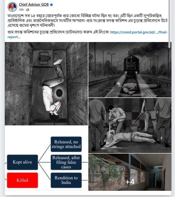 গতকাল (১৩ জানুয়ারি) বাংলাদেশে জোরপূর্বক গুম বিষয়ক তদন্ত কমিশন চূড়ান্ত প্রতিবেদন প্রকাশ করেছে। প্রতিবেদনটির শিরোনাম: ‘আনফোল্ডিং দ্য ট্রুথ: আ স্ট্রাকচারাল ডায়াগনোসিস অব এনফোর্সড ডিজঅ্যাপিয়ারেন্স ইন বাংলাদেশ’।