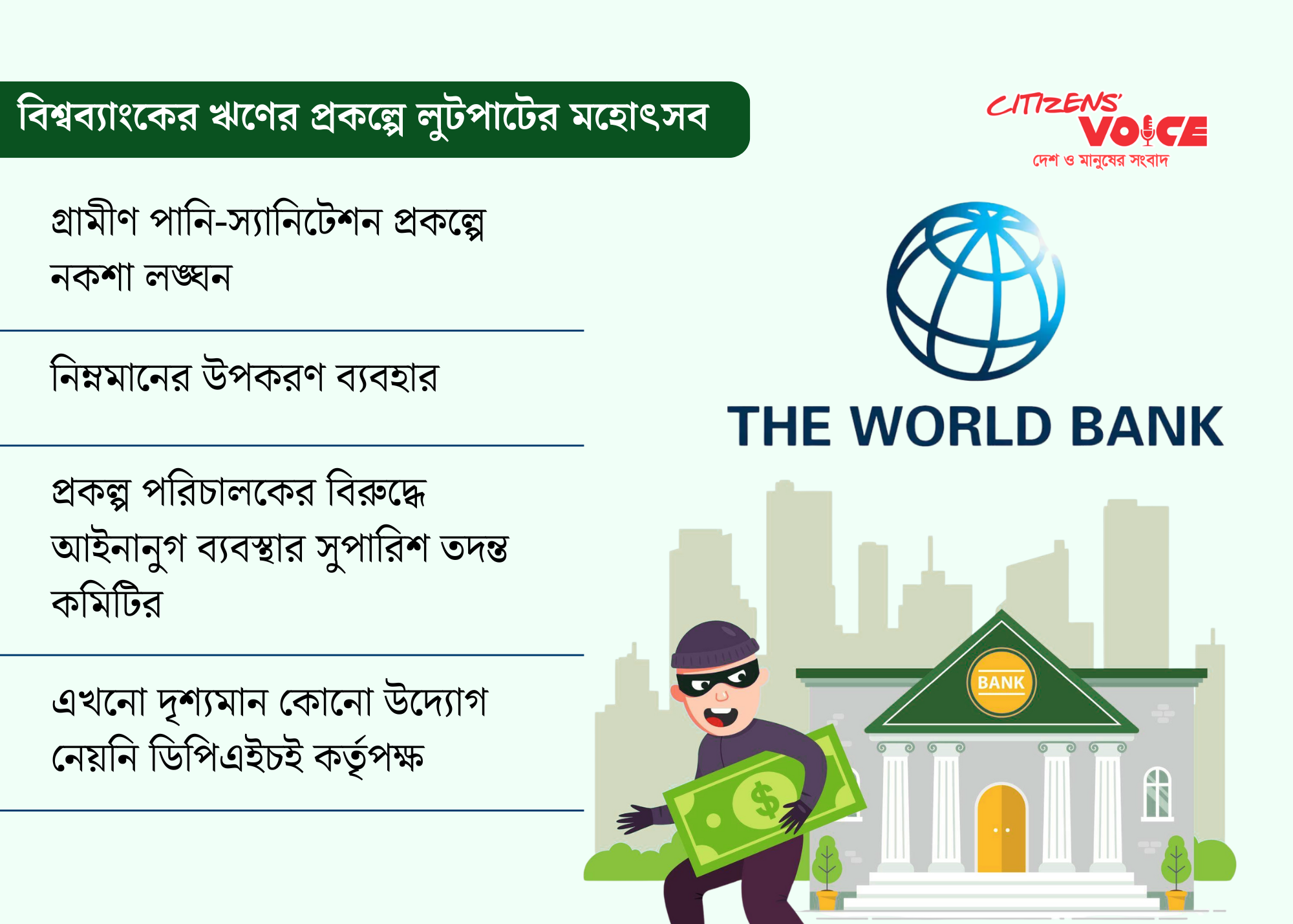সরকারি তদন্তে প্রকাশ, বিশ্বব্যাংকের ঋণে বাস্তবায়নাধীন গ্রামীণ পানি সরবরাহ ও স্যানিটেশন প্রকল্পে ভয়াবহ অনিয়ম ও দুর্নীতি হয়েছে। জনস্বাস্থ্য প্রকৌশল অধিদপ্তরের (ডিপিএইচই) ‘মানবসম্পদ উন্নয়নে গ্রামীণ পানি সরবরাহ, স্যানিটেশন এবং স্বাস্থ্যবিধি (১ম সংশোধিত)’ প্রকল্পে নকশা অমান্য, নিম্নমানের উপকরণ ব্যবহার, অকার্যকর স্থাপনা নির্মাণ এবং প্রকল্প ব্যবস্থাপনায় চরম গাফিলতি ধরা পড়েছে।