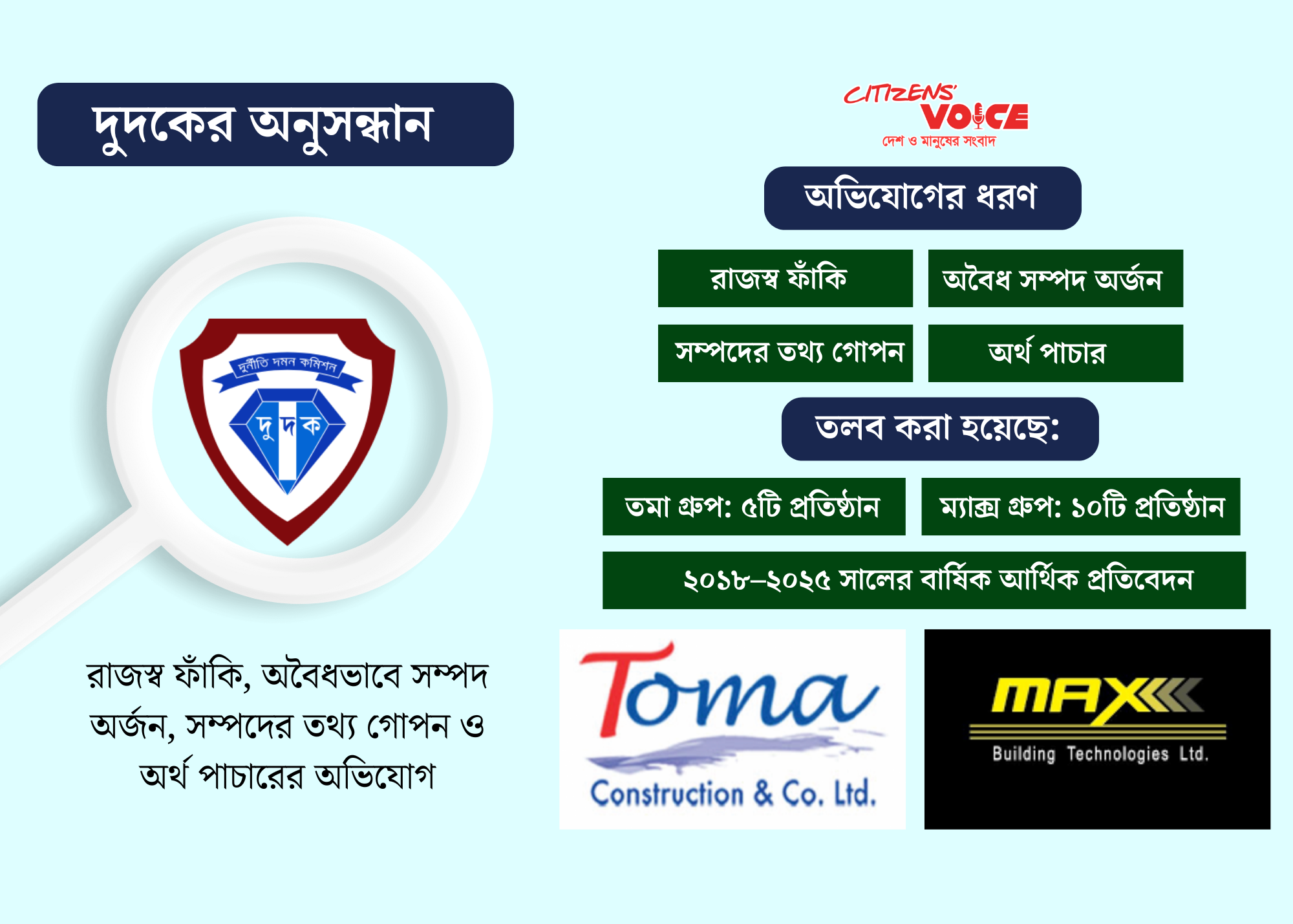 দুর্নীতি দমন কমিশন (দুদক) রাজস্ব ফাঁকি, অবৈধ সম্পদ অর্জন, সম্পদের তথ্য গোপন এবং অর্থ পাচারের অভিযোগে তমা ও ম্যাক্স গ্রুপের মালিকদের বিরুদ্ধে অনুসন্ধান শুরু করেছে। অনুসন্ধানের অংশ হিসেবে দুদক তমা গ্রুপের ৫টি এবং ম্যাক্স গ্রুপের ১০টি অঙ্গপ্রতিষ্ঠানের বার্ষিক আর্থিক প্রতিবেদন (অডিট রিপোর্ট) তলব করেছে।