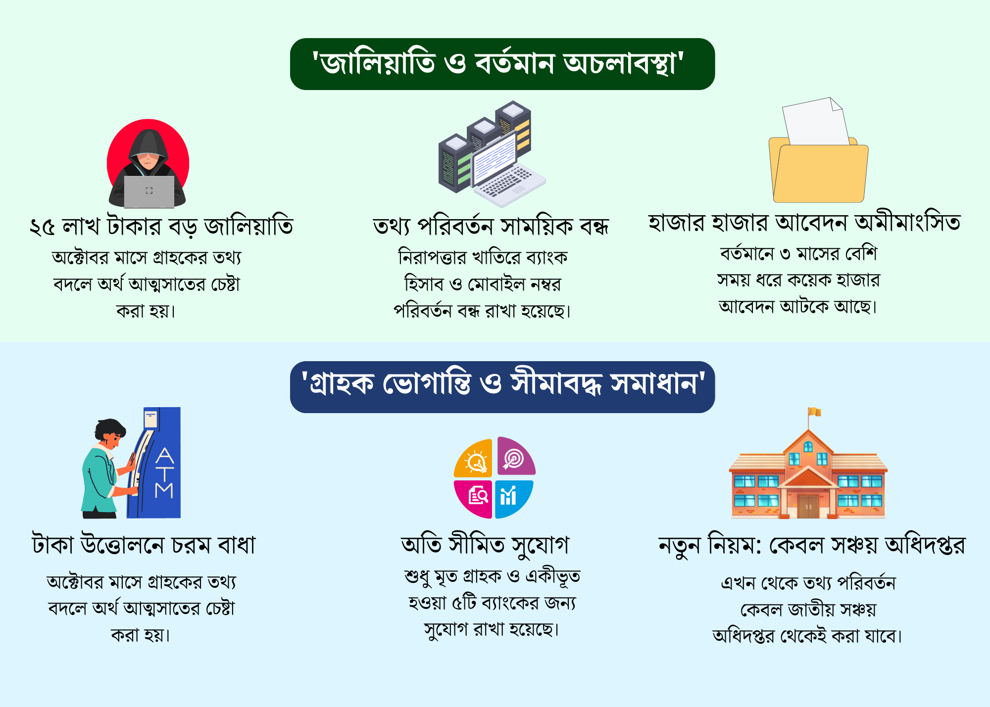 জালিয়াতির ঘটনা তদন্তের পর নিরাপত্তা জোরদার করতে গ্রাহকদের ব্যাংক হিসাব ও মোবাইল নম্বর পরিবর্তনের প্রক্রিয়া বন্ধ করে দেওয়া হয়। কিন্তু এর প্রভাব পড়েছে মূলত সাধারণ গ্রাহকদের ওপর। বহু মানুষ নতুন হিসাব যুক্ত করতে না পারায় তাদের সঞ্চয়পত্রে থাকা অর্থ সরাসরি সংগ্রহ করা সম্ভব হচ্ছে না। মোটের ওপর, নিরাপত্তা নিশ্চিতের জন্য নেওয়া পদক্ষেপই গ্রাহকদের জন্য বড় ধরনের অসুবিধার কারণ হয়ে দাঁড়িয়েছে।