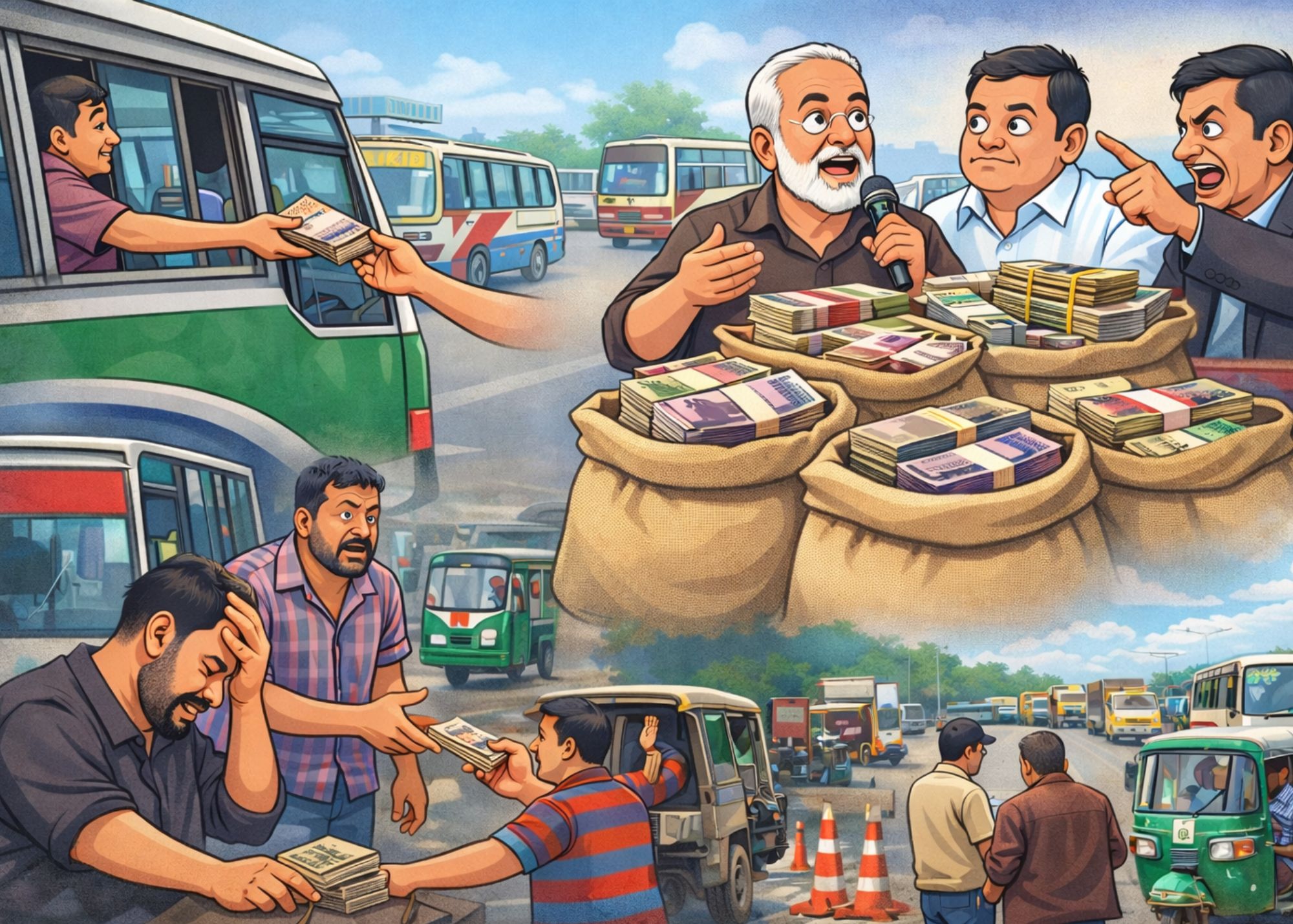দুর্নীতির বিরুদ্ধে নজরদারি সংস্থা টিআইবির একটি গবেষণায় বলা হয়েছে, ব্যক্তিমালিকানাধীন বাস ও মিনিবাস থেকে বছরে ১ হাজার ৫৯ কোটি টাকা চাঁদাবাজি হয়। দলীয় পরিচয়ধারী ব্যক্তি বা গোষ্ঠী, ট্রাফিক ও হাইওয়ে পুলিশ, বিআরটিএ, মালিক-শ্রমিক সংগঠন এবং স্থানীয় সরকারের প্রতিনিধিরা এই অর্থের ভাগ পান। অনেক ক্ষেত্রে কল্যাণ তহবিলের নামে নেওয়া টাকার লিখিত রসিদ বা বার্ষিক হিসাব শ্রমিকদের দেখানো হয় না।
