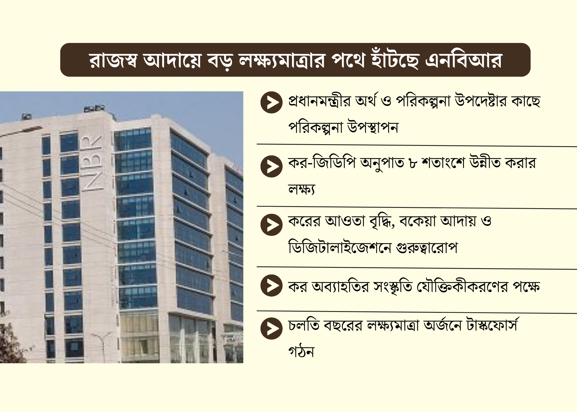 রাজস্ব আদায়ে এনবিআর ইতিমধ্যেই লক্ষ্যমাত্রা পূরণে ব্যর্থ। চলতি অর্থবছরের প্রথম সাত মাসে ৬০ হাজার কোটি টাকার ঘাটতি দেখা দিয়েছে। এজন্য আয়কর, ভ্যাট ও কাস্টমস—তিনটি খাতে পৃথক টাস্কফোর্স গঠন করা হয়েছে। ভ্যাট আদায়ের টাস্কফোর্স ইতোমধ্যে কাজ শুরু করেছে। কাস্টমসেও বকেয়া আদায় ও ব্যাংক গ্যারান্টির নগদায়নসহ বিভিন্ন উদ্যোগ নেওয়া হচ্ছে।