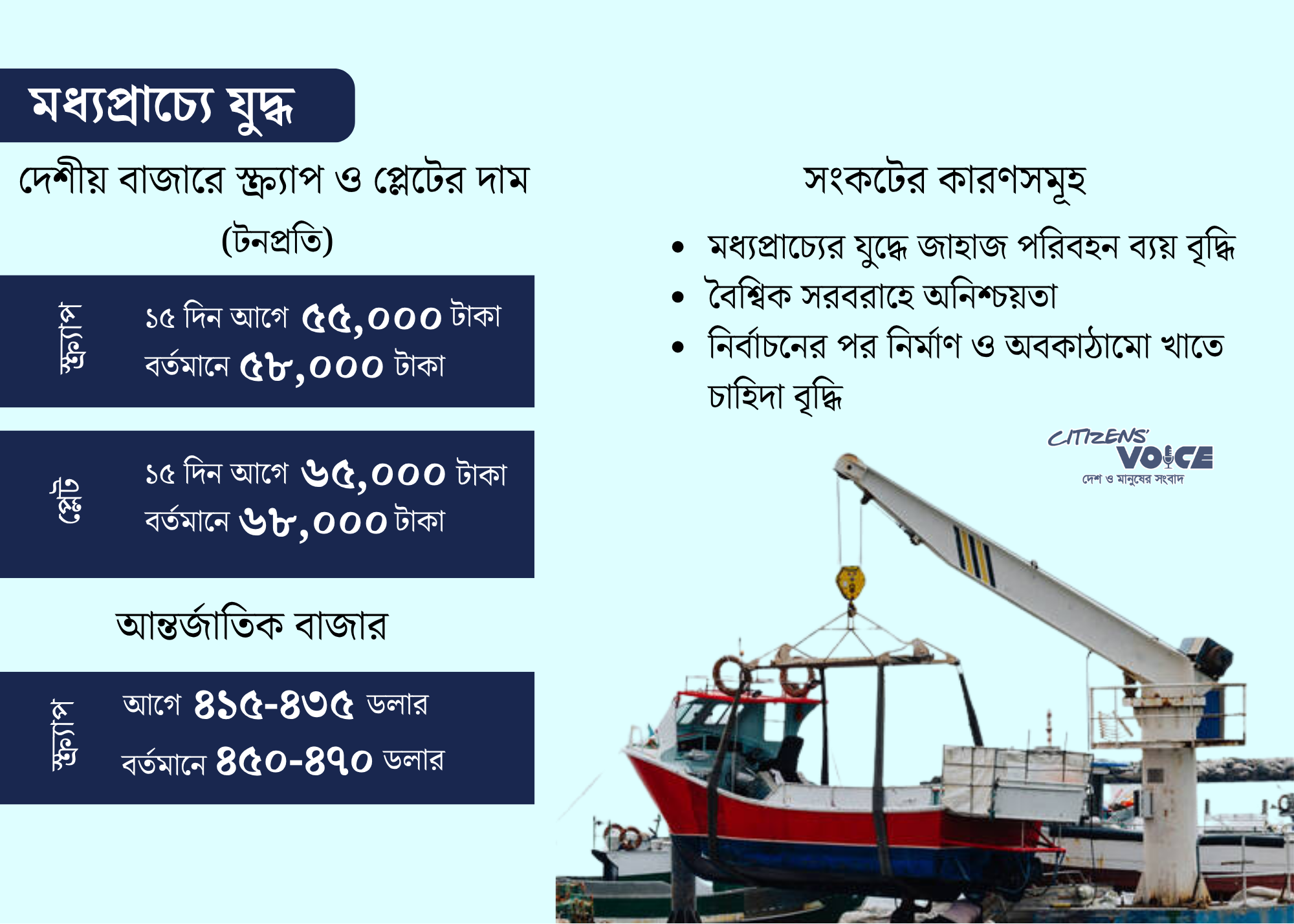চট্টগ্রামের জাহাজ ভাঙা শিল্পের তথ্য অনুযায়ী, গত দুই সপ্তাহে স্ক্র্যাপের দাম টনপ্রতি ৩ হাজার টাকা বৃদ্ধি পেয়ে ৫৮ হাজার টাকা এবং প্লেটের দাম বেড়ে ৬৮ হাজার টাকায় পৌঁছেছে। আন্তর্জাতিক বাজারেও একই ধারা লক্ষ্য করা গেছে।
