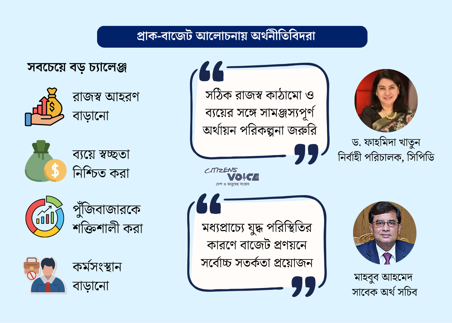 সাবেক অর্থ সচিব মাহবুব আহমেদ বলেন, “বর্তমান আন্তর্জাতিক পরিস্থিতি অত্যন্ত অস্থির। যুদ্ধ পরিস্থিতির কারণে বাজেট প্রণয়নে সর্বোচ্চ সতর্কতা প্রয়োজন। প্রবৃদ্ধি ও কর্মসংস্থান বাড়ানো এবং মূল্যস্ফীতি নিয়ন্ত্রণ—এই দুইয়ের মধ্যে ভারসাম্য রক্ষা করাই বড় চ্যালেঞ্জ।”