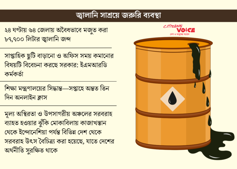 তবে নিরাপত্তা নিশ্চিত করতে সরকারের পক্ষ থেকে জরুরি তেল আমদানির অনুমোদন দেওয়া হয়েছে। জনগণকে আতঙ্কিত না হতে এবং হঠাৎ করে জ্বালানি সংগ্রহে না ঝাপিয়ে পড়ার আহ্বান জানানো হয়েছে। একই সময়ে, কিছু ব্যবসায়ী তেল জমিয়ে বাজারে কৃত্রিম সংকট সৃষ্টি করার চেষ্টা করছিল। এই অবৈধ স্টক উদ্ধারের জন্য যৌথ বাহিনী অভিযান চালাচ্ছে।