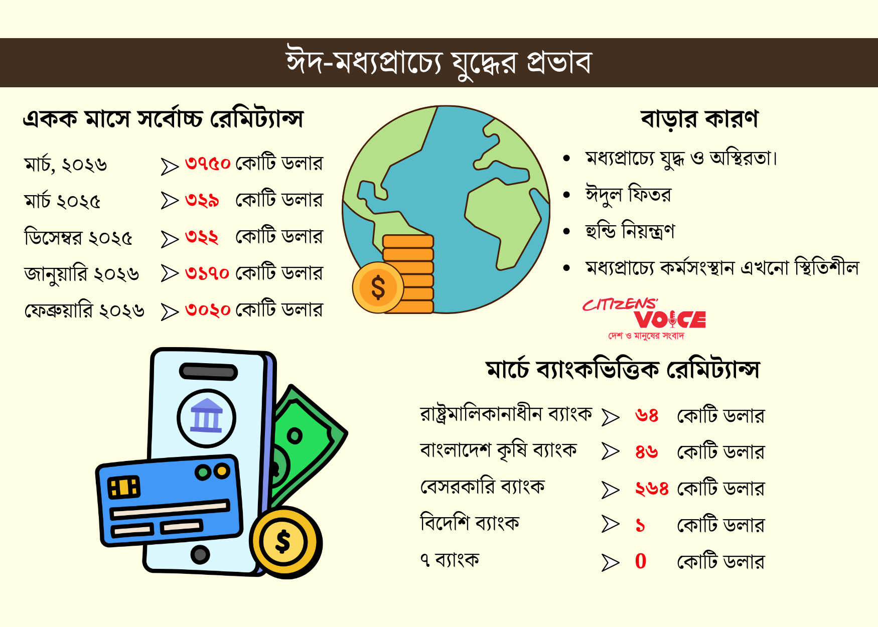 বিশ্লেষকদের মতে, রেমিট্যান্সের এই আকস্মিক উল্লম্ফনের পেছনে একাধিক কারণ কাজ করেছে। মধ্যপ্রাচ্যে ইরানকে ঘিরে চলমান যুদ্ধ পরিস্থিতি অনেক প্রবাসীকে তাদের সঞ্চিত অর্থ দ্রুত দেশে পাঠাতে প্ররোচিত করেছে। এছাড়া ঈদুল ফিতরের আগমনী বার্তায় স্বজনদের জন্য অতিরিক্ত অর্থ পাঠানোর প্রবণতাও বৃদ্ধি পেয়েছে।