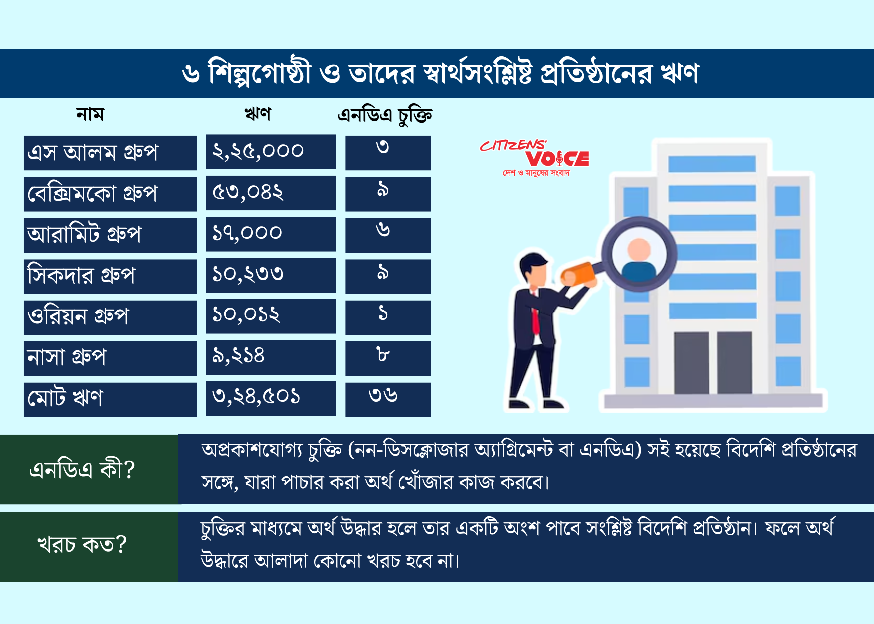 এর মধ্যে বসুন্ধরা গ্রুপের ঋণ প্রায় ৩৫ হাজার কোটি টাকা, নাবিল গ্রুপের ৯ হাজার ৪০৫ কোটি, জেমকন গ্রুপের ২ হাজার ১১৩ কোটি এবং সামিট গ্রুপের ১ হাজার ৩৩৫ কোটি টাকা। প্রিমিয়ার গ্রুপের ঋণের পরিমাণ প্রতিবেদনে পাওয়া যায়নি। তদন্ত ও টাকা উদ্ধারের জন্য চুক্তি বিষয়ে ছয়টি শিল্পগোষ্ঠীর বক্তব্য জানতে ই-মেইল ও মুঠোফোনের মাধ্যমে যোগাযোগ করা হয়েছে। তবে বেশিরভাগের পক্ষ থেকে কোনো প্রতিক্রিয়া পাওয়া যায়নি। তাদের মধ্যে কিছু কর্ণধার কারাগারে, কেউ কেউ বিদেশে পলাতক রয়েছেন।