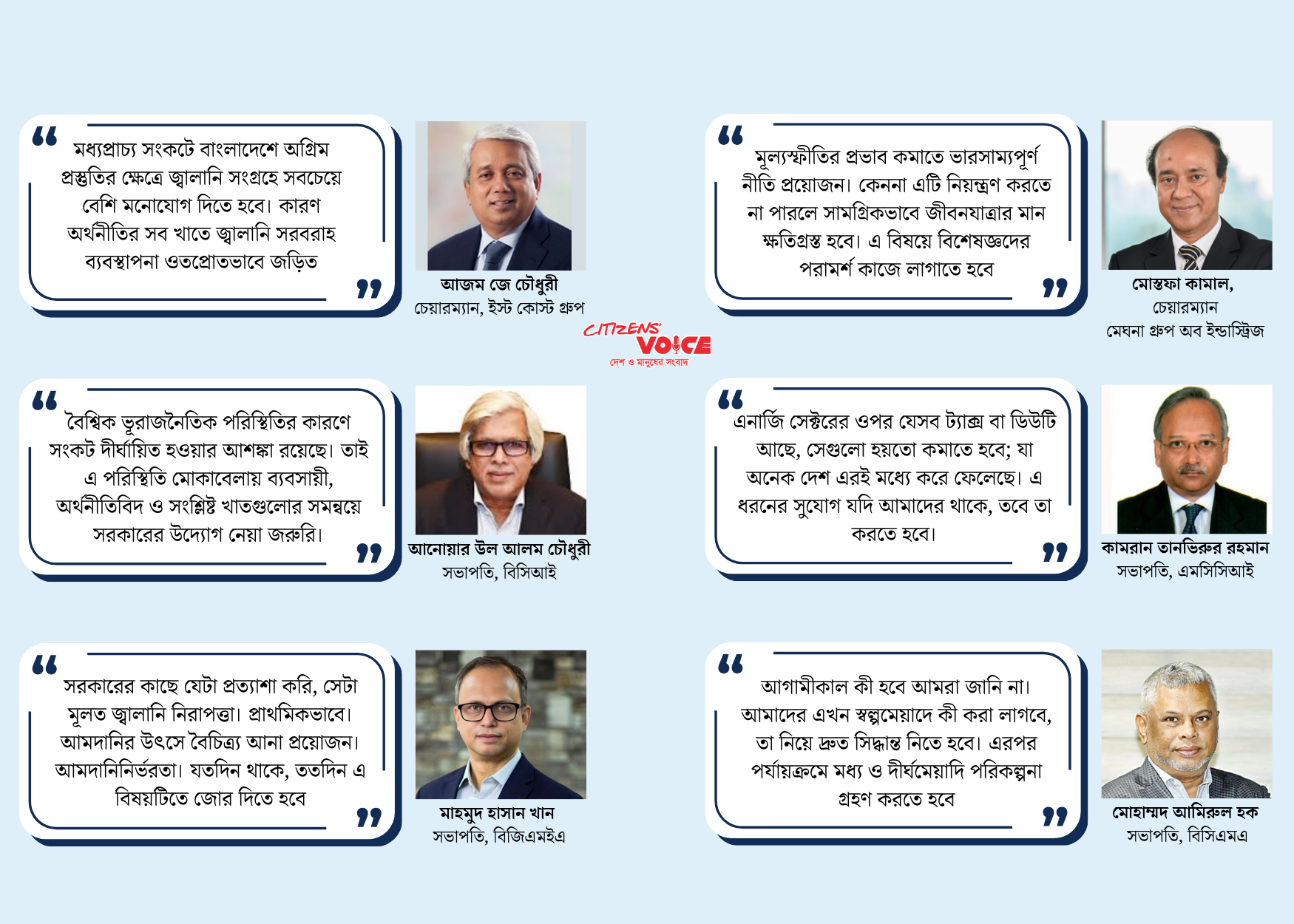 ইস্ট কোস্ট গ্রুপের চেয়ারম্যান আজম জে চৌধুরী বলেন, “মধ্যপ্রাচ্য সংকট মোকাবেলায় বাংলাদেশের অগ্রিম প্রস্তুতিতে জ্বালানি সংগ্রহে সবচেয়ে বেশি মনোযোগ দিতে হবে। কারণ অর্থনীতির সব খাতে জ্বালানি সরবরাহ ব্যবস্থাপনা সরাসরি জড়িত। সরকার বিকল্প উৎস থেকে জ্বালানি সংগ্রহের চেষ্টা করছে, এটা ভালো উদ্যোগ। তবে উৎস আরও বাড়ানো প্রয়োজন। হয়তো পেমেন্ট বেশি লাগবে, কিন্তু অর্থনীতি ঠিক রাখতে এটা করতে হবে। পৃথিবীর ২০ শতাংশ জ্বালানি হরমুজ প্রণালী ব্যবহার করে, আর বাংলাদেশের ক্ষেত্রে ৯০ শতাংশ জ্বালানি মধ্যপ্রাচ্যকে ঘিরে। ফলে অগ্রিম প্রস্তুতি নেওয়া গেলে অর্থনীতি স্থিতিশীল রাখতে বাকি পদক্ষেপগুলোও সহজ হবে।”