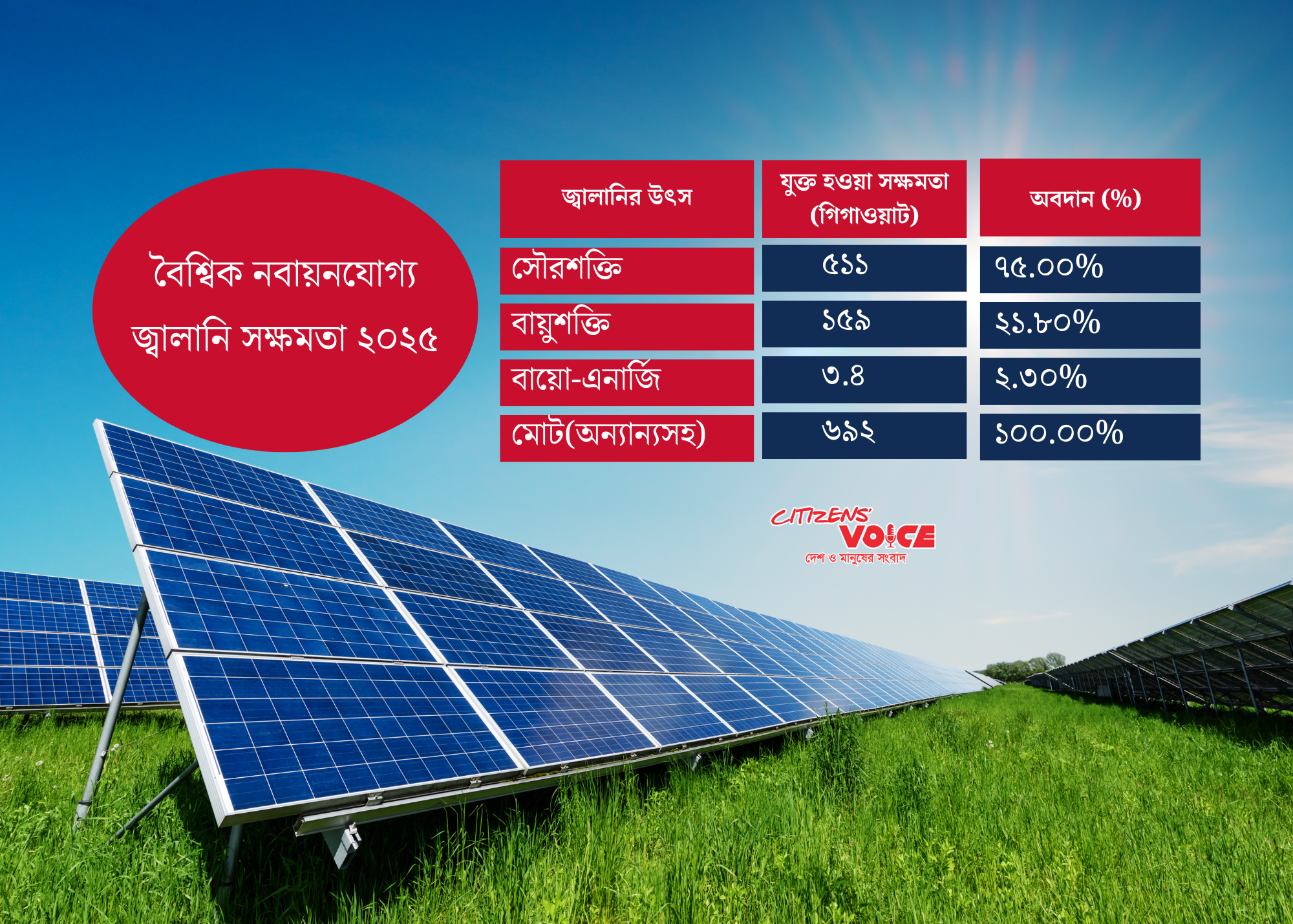 প্রতিবেদনে বলা হয়েছে, বৃদ্ধির বড় অংশ এসেছে সৌরশক্তি থেকে। গত বছর ৫১১ গিগাওয়াট সৌরশক্তি সক্ষমতা যুক্ত হয়েছে, যা মোট বৃদ্ধির প্রায় ৭৫ শতাংশ। সৌরশক্তির পরে রয়েছে বায়ুশক্তি, যা থেকে এসেছে ১৫৯ গিগাওয়াট। মিলিয়ে দেখা যায়, সৌর ও বায়ুশক্তি একসাথে গত বছরের নিট নবায়নযোগ্য সক্ষমতার ৯৬.৮ শতাংশ জোরদার করেছে।