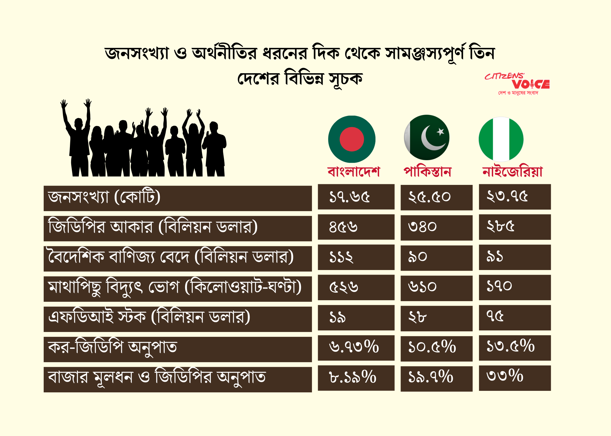 জিডিপি আকারে এগিয়ে থাকা সত্ত্বেও অন্যান্য সূচকে বাংলাদেশ বেশ পিছিয়ে। বিদেশী সরাসরি বিনিয়োগ (FDI) স্টক বাংলাদেশে ১৯.৫০ বিলিয়ন ডলার, যেখানে পাকিস্তান ২৮ বিলিয়ন এবং নাইজেরিয়া ৭৫ বিলিয়ন ডলার। কর-জিডিপি অনুপাত বাংলাদেশে ৬.৭৩ শতাংশ, পাকিস্তানে ১০.৫ শতাংশ এবং নাইজেরিয়ায় ১৩.৫ শতাংশ। বাজার মূলধন ও জিডিপির অনুপাত বাংলাদেশে ৮.১৯ শতাংশ, নাইজেরিয়ায় ৩৩ শতাংশ এবং পাকিস্তানে ১৯.৭ শতাংশ। জিডিপি বাড়লে এই সূচকগুলোর উন্নতি স্বাভাবিকভাবে হওয়া উচিত।