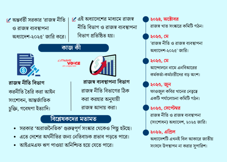 অন্তর্বর্তী সরকার ২০২৫ সালের ১২ মে দীর্ঘদিনের প্রত্যাশিত সংস্কারের অংশ হিসেবে এই অধ্যাদেশ জারি করেছিল। অধ্যাদেশ অনুযায়ী, জাতীয় রাজস্ব বোর্ড (এনবিআর) পুনর্গঠন করে দুটি বিভাগে ভাগ করা হয়। প্রথমটি হলো রাজস্ব নীতি বিভাগ, যা করনীতি তৈরি, আইন সংশোধন, আন্তর্জাতিক চুক্তি ও গবেষণার দায়িত্বে থাকবে। এর অর্থ, করহার নির্ধারণের দায়িত্ব এবার এই বিভাগ করবে। অন্যটি হলো রাজস্ব ব্যবস্থাপনা বিভাগ, যা মূলত কর আদায় করবে।