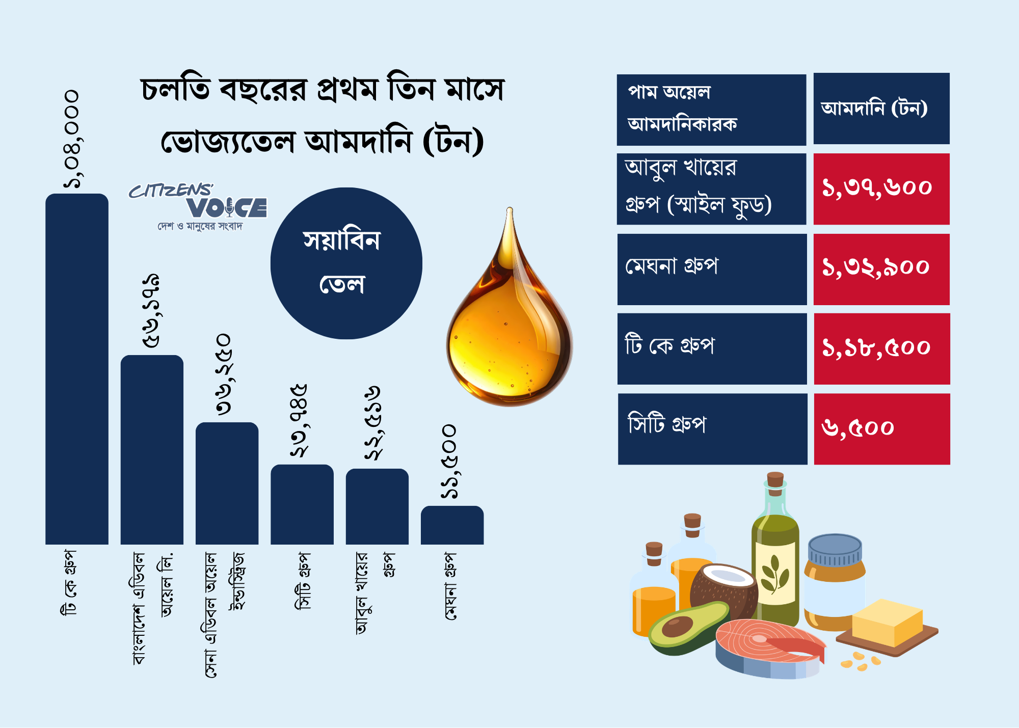 বর্তমানে সয়াবিন ও পাম তেলের বড় পরিসরের আমদানি এবং সরবরাহ মূলত তিনটি কনগ্লোমারেটের ওপর নির্ভরশীল হয়ে পড়েছে—টি কে গ্রুপ, মেঘনা গ্রুপ অব ইন্ডাস্ট্রিজ (এমজিআই) এবং আবুল খায়ের। বিশেষ করে সয়াবিন তেলের আমদানি ও পরিশোধন প্রায় এককভাবে টি কে গ্রুপের হাতে কেন্দ্রীভূত। তবে ভোজ্যতেলের ঋণপত্র (এলসি) খোলার হার কমে যাওয়ায় আসন্ন ঈদুল আজহার আগে সরবরাহে সংকটের আশঙ্কা তৈরি হয়েছে।