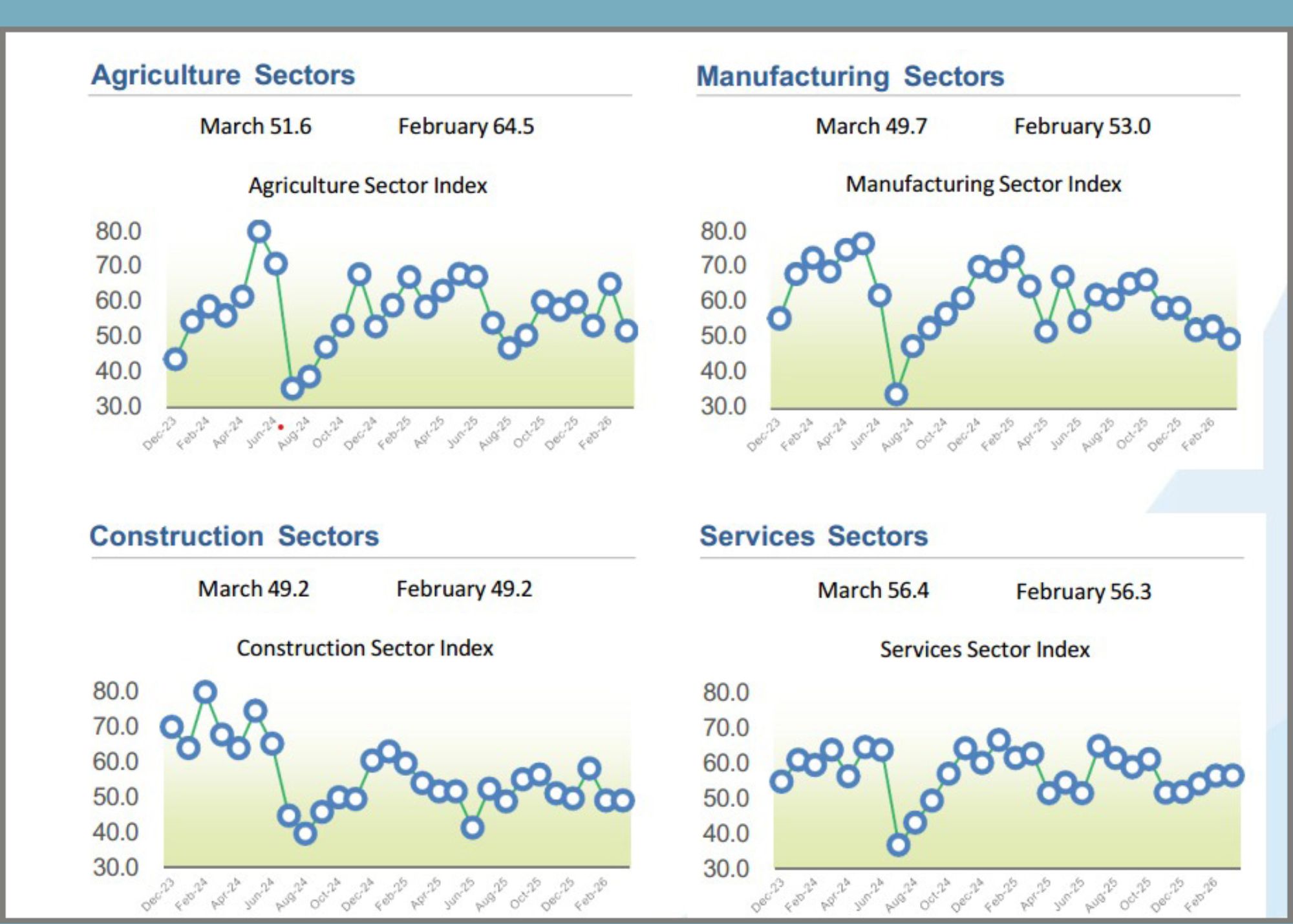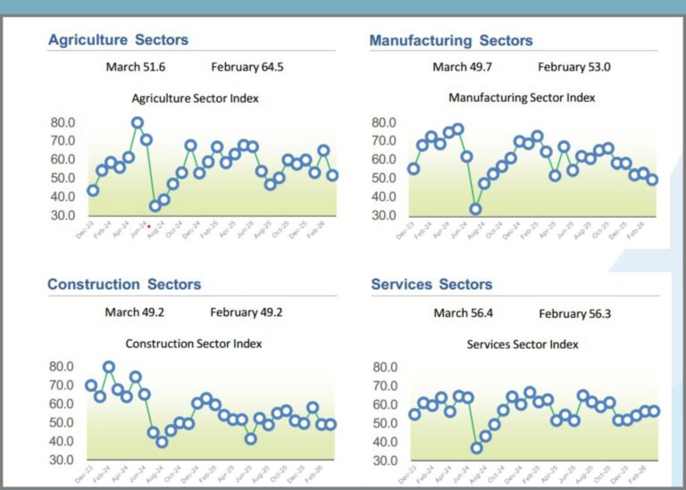 কৃষি খাতের পিএমআই মার্চে ৫১.৬, যা ফেব্রুয়ারির ৬৪.৫ থেকে কমেছে। যদিও গতিমাত্রা কমেছে, খাতটি ধারাবাহিকভাবে সপ্তম মাসে সম্প্রসারণে রয়েছে। উৎপাদন খাত ১৮ মাসের সম্প্রসারণের পর প্রথমবারের মতো সংকোচনে এসেছে। ফেব্রুয়ারি মাসে সূচক ছিল ৫৩, মার্চে কমে ৫৯.৭। নতুন অর্ডার, রপ্তানি, সমাপ্ত পণ্য, আমদানি ও কর্মসংস্থান হ্রাস পেয়েছে। তবে কারখানা উৎপাদন, ইনপুট ক্রয় ও সরবরাহকারীর ডেলিভারিতে সম্প্রসারণ অব্যাহত রয়েছে।
