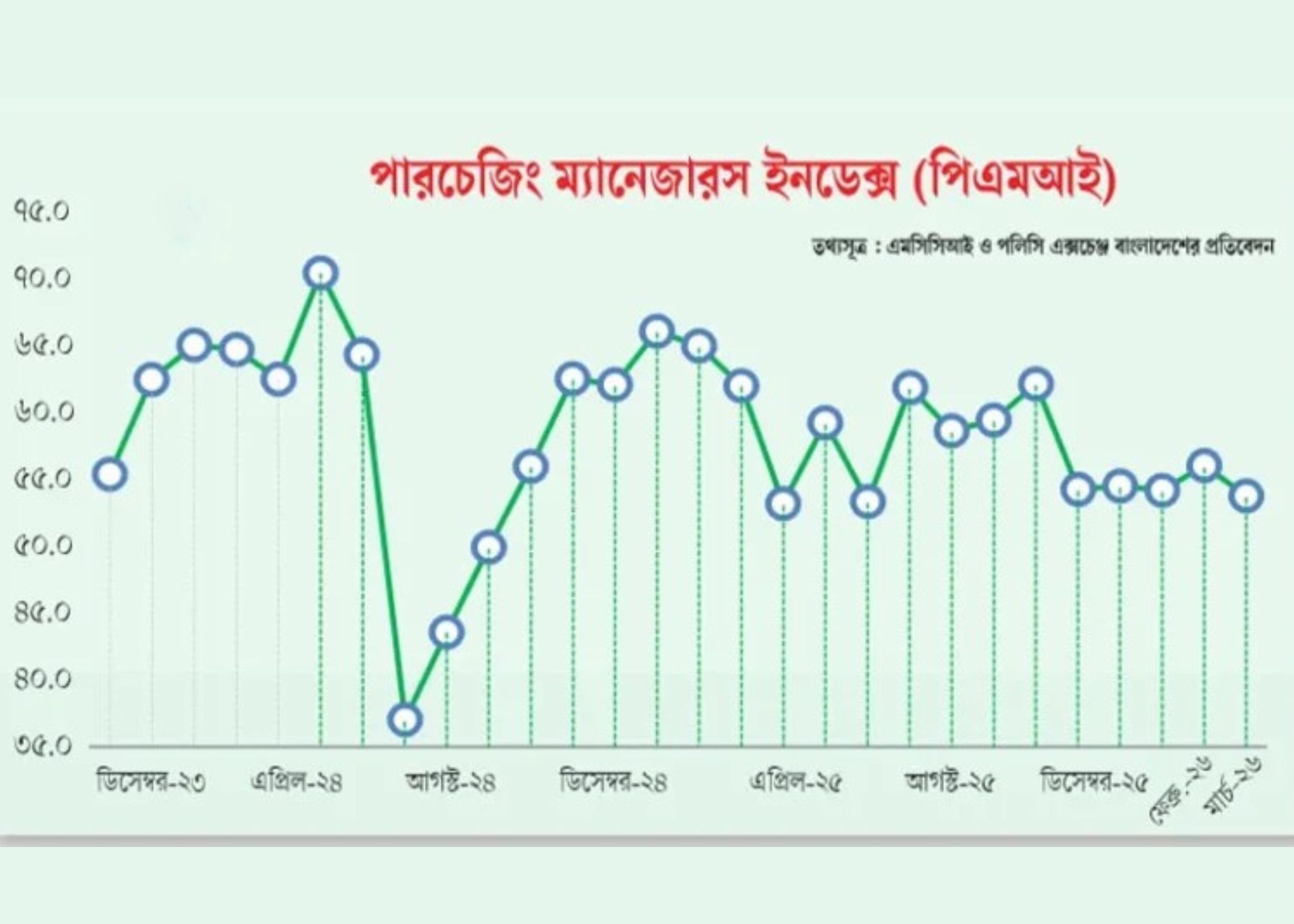 প্রতিবেদন অনুযায়ী, কৃষি খাত টানা সপ্তম মাসের মতো সম্প্রসারণ ধরে রেখেছে। তবে মার্চে এর গতি কিছুটা কমেছে। অন্যদিকে, টানা ১৮ মাস সম্প্রসারণের পর উৎপাদন খাত প্রথমবারের মতো সংকোচনে পড়েছে। নতুন অর্ডার, রপ্তানি, সমাপ্ত পণ্য, আমদানি এবং কর্মসংস্থান—এই সূচকগুলোতে দুর্বলতা দেখা যাওয়ায় এ খাতে পতন নেমে এসেছে।