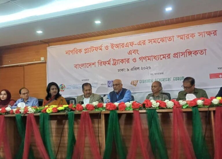 আজ বৃহস্পতিবার রাজধানীর পল্টনে ইকোনমিক রিপোর্টার্স ফোরাম (ইআরএফ) মিলনায়তনে ‘নাগরিক প্ল্যাটফর্ম ও ইআরএফের সমঝোতা স্মারক সাক্ষর এবং বাংলাদেশ রিফর্ম ট্র্যাকার ও গণমাধ্যমের প্রাসঙ্গিকতা’ শীর্ষক অনুষ্ঠানে তিনি এসব কথা বলেন। ইআরএফ সভাপতি দৌলত আকতার মালার সভাপতিত্বে অনুষ্ঠানে প্রধান অতিথি ছিলেন তথ্য ও সম্প্রচার মন্ত্রী জহির উদ্দিন স্বপন। এছাড়া বক্তব্য দেন সম্পাদক পরিষদের সভাপতি এবং ইংরেজি দৈনিক নিউ এইজের সম্পাদক নূরুল কবীর, দ্য ফিন্যান্সিয়াল এক্সপ্রেসের সম্পাদক শামসুল হক জাহিদ, প্রথম আলোর হেড অব অনলাইন শওকত হোসেন প্রমুখ।
