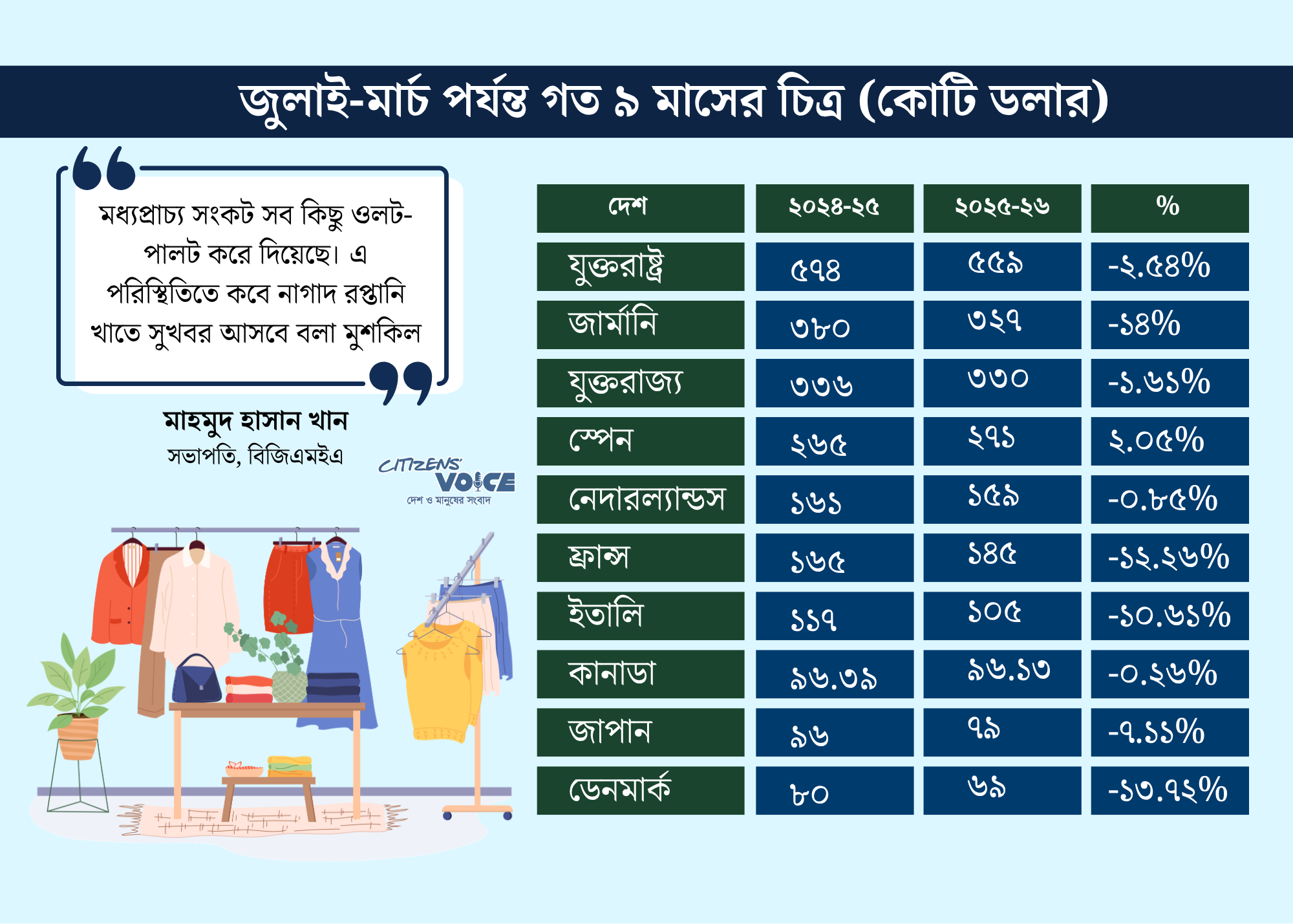 বিশ্লেষণে দেখা যায়, এসব দেশের মধ্যে ৯টি বাজারেই আগের একই সময়ের তুলনায় রপ্তানি আয় হ্রাস পেয়েছে। একমাত্র ব্যতিক্রম স্পেন, যেখানে তৈরি পোশাক রপ্তানি প্রায় ২ শতাংশ বেড়েছে।