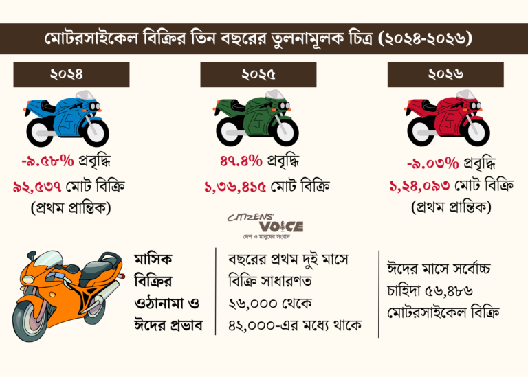 প্রথম প্রান্তিক (জানুয়ারি–মার্চ) হিসাবেও দেখা গেছে পতন। ২০২৫ সালের এই সময়ে মোটরসাইকেল বিক্রি হয়েছিল প্রায় ১ লাখ ৩৭ হাজারটি। ২০২৬ সালে তা কমে দাঁড়িয়েছে ১ লাখ ২৪ হাজারে। অর্থাৎ এক বছরের ব্যবধানে বিক্রি কমেছে প্রায় ১৩ হাজার বা ৯ দশমিক ৭ শতাংশ।