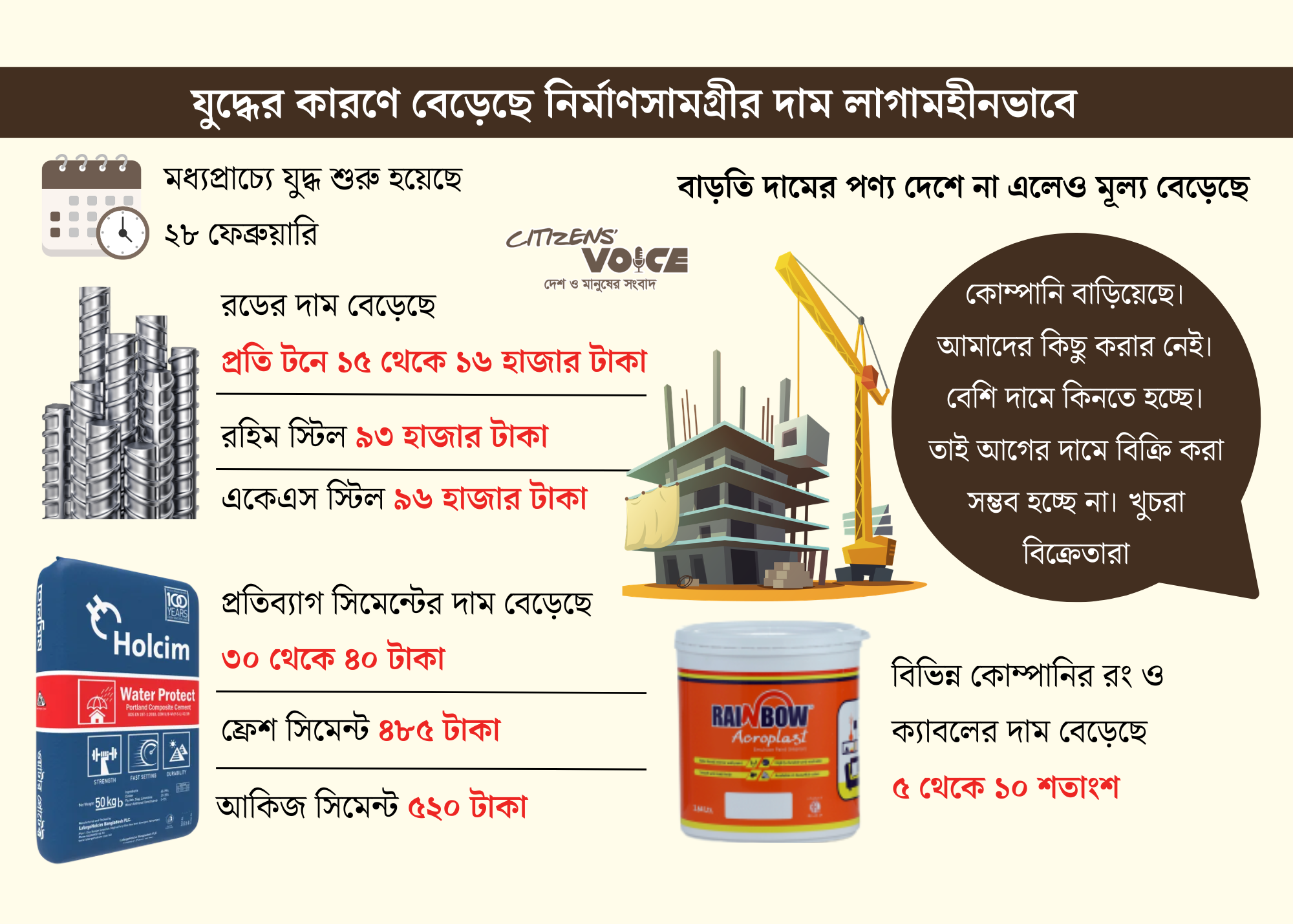 মধ্যপ্রাচ্যে চলমান যুদ্ধ শুরু হয়েছে গত ২৮ ফেব্রুয়ারি। এরপর থেকেই দেশের নির্মাণসামগ্রীর বাজারে অস্থিরতা দেখা দিয়েছে। যদিও আমদানি করা অনেক পণ্যের সরাসরি দাম না বাড়লেও রড, সিমেন্ট, রং ও বৈদ্যুতিক তারসহ নির্মাণ খাতে ব্যবহৃত প্রায় সব পণ্যের দাম লাগামহীনভাবে বেড়ে গেছে। এতে চাপে পড়েছেন সাধারণ ক্রেতা ও নির্মাণসংশ্লিষ্ট ব্যবসায়ীরা। গতকাল শনিবার (১১ এপ্রিল) রাজধানীর বিভিন্ন বাজার ঘুরে এবং ক্রেতা-বিক্রেতাদের সঙ্গে কথা বলে এসব তথ্য জানা গেছে।