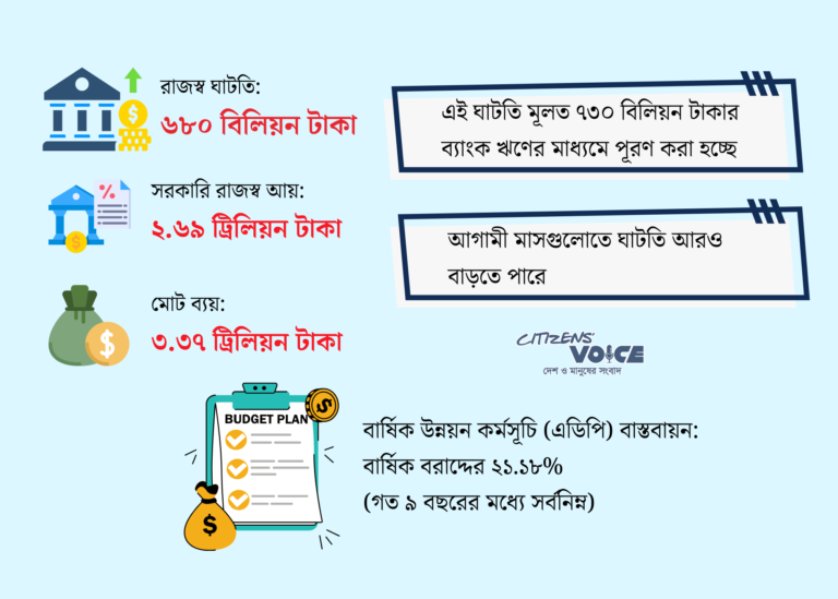 বাংলাদেশ ব্যাংকের তথ্য অনুযায়ী, জুলাই ২০২৫ থেকে জানুয়ারি ২০২৬ পর্যন্ত বাজেট ঘাটতি দাঁড়িয়েছে ৬৮০ বিলিয়ন টাকা। আগের অর্থবছরের একই সময়ে এই ঘাটতি ছিল ৭১৭ বিলিয়ন টাকা অর্থাৎ এবার ঘাটতি প্রায় ৫ শতাংশ কমেছে। এই সময়ে সরকারের মোট আয় হয়েছে ২.৬৯ ট্রিলিয়ন টাকা। এর মধ্যে কর ও করবহির্ভূত—দুই ধরনের আয়ই অন্তর্ভুক্ত রয়েছে। অন্যদিকে মোট ব্যয় দাঁড়িয়েছে ৩.৩৭ ট্রিলিয়ন টাকা। আয়-ব্যয়ের এই ব্যবধানই তৈরি করেছে ঘাটতি।