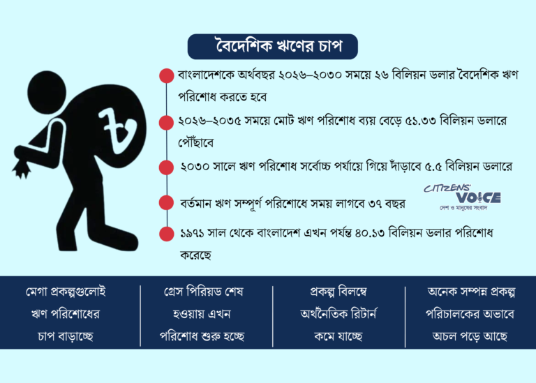 আগামী পাঁচ বছরে ২৬ বিলিয়ন ডলার বৈদেশিক ঋণ পরিশোধের চাপের মুখে পড়ছে বাংলাদেশ। একই সঙ্গে বাড়ছে দেশের সামগ্রিক আর্থিক চাপ, যা বিদ্যমান রাজস্ব সক্ষমতার সীমাবদ্ধতাকে আরও স্পষ্ট করে তুলছে।
