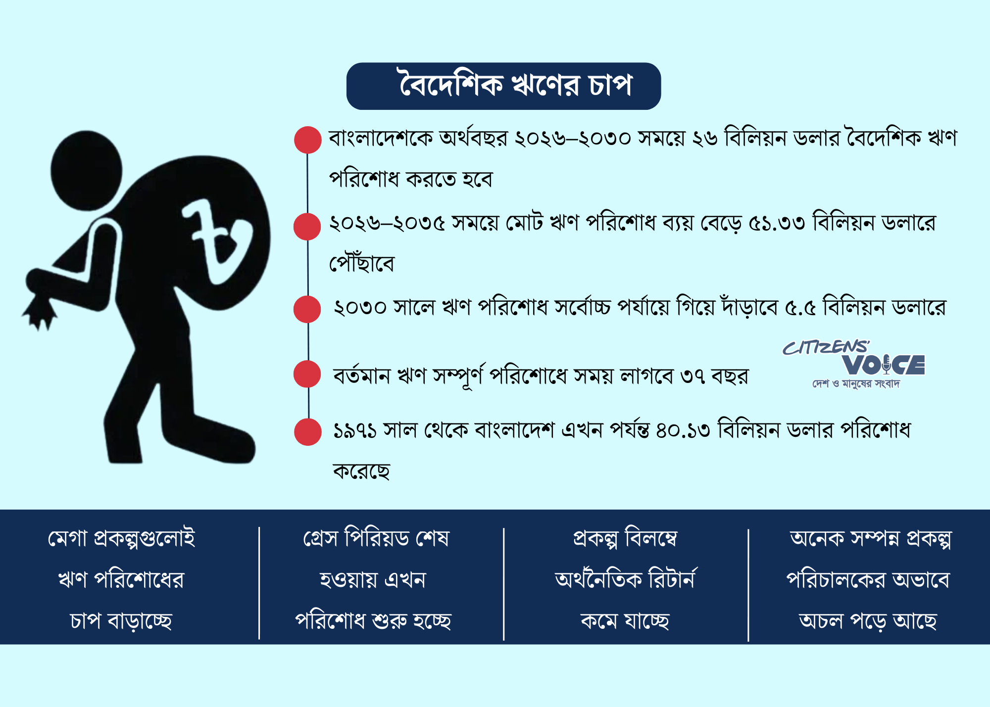 অর্থনৈতিক সম্পর্ক বিভাগ (ইআরডি)-এর সর্বশেষ প্রতিবেদনের তথ্য অনুযায়ী, চলতি অর্থবছর থেকে ২০৩০ অর্থবছর পর্যন্ত বাংলাদেশকে প্রায় ২৬ বিলিয়ন ডলার বৈদেশিক ঋণ পরিশোধ করতে হবে। ঐতিহাসিক পরিসংখ্যান এই চাপকে আরও বেশি গুরুত্বের সঙ্গে সামনে আনে। ১৯৭১ সালে স্বাধীনতার পর গত ৫৪ বছরে বাংলাদেশ মোট প্রায় ৪০ বিলিয়ন ডলার বৈদেশিক ঋণ পরিশোধ করেছে। কিন্তু সেই পরিমাণের প্রায় দুই-তৃতীয়াংশের সমান অর্থ এখন মাত্র আগামী পাঁচ বছরের মধ্যেই পরিশোধ করতে হবে।