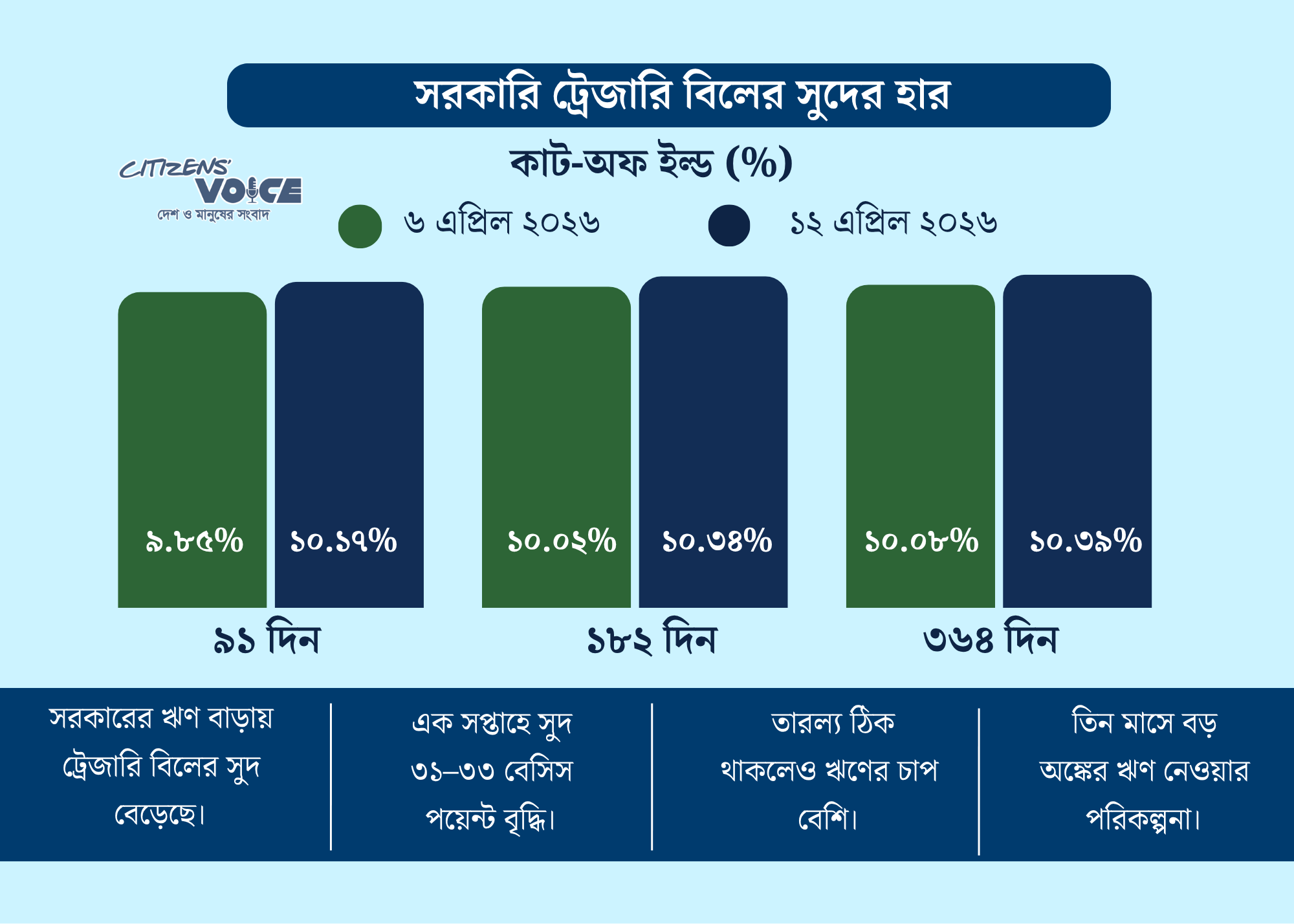 সরকারের ব্যাংকঋণ নির্ভরতা বাড়ায় আবারও ঊর্ধ্বমুখী হয়েছে ট্রেজারি বিলের সুদহার। টাকার চাহিদা বৃদ্ধি এবং রাজস্ব আদায়ে ধীরগতির কারণে ব্যাংক থেকে ঋণ গ্রহণ বেড়েছে সরকারের। এর প্রভাব পড়েছে স্বল্পমেয়াদি সুদহারে, যা আবারও বাড়ার প্রবণতা দেখাচ্ছে।