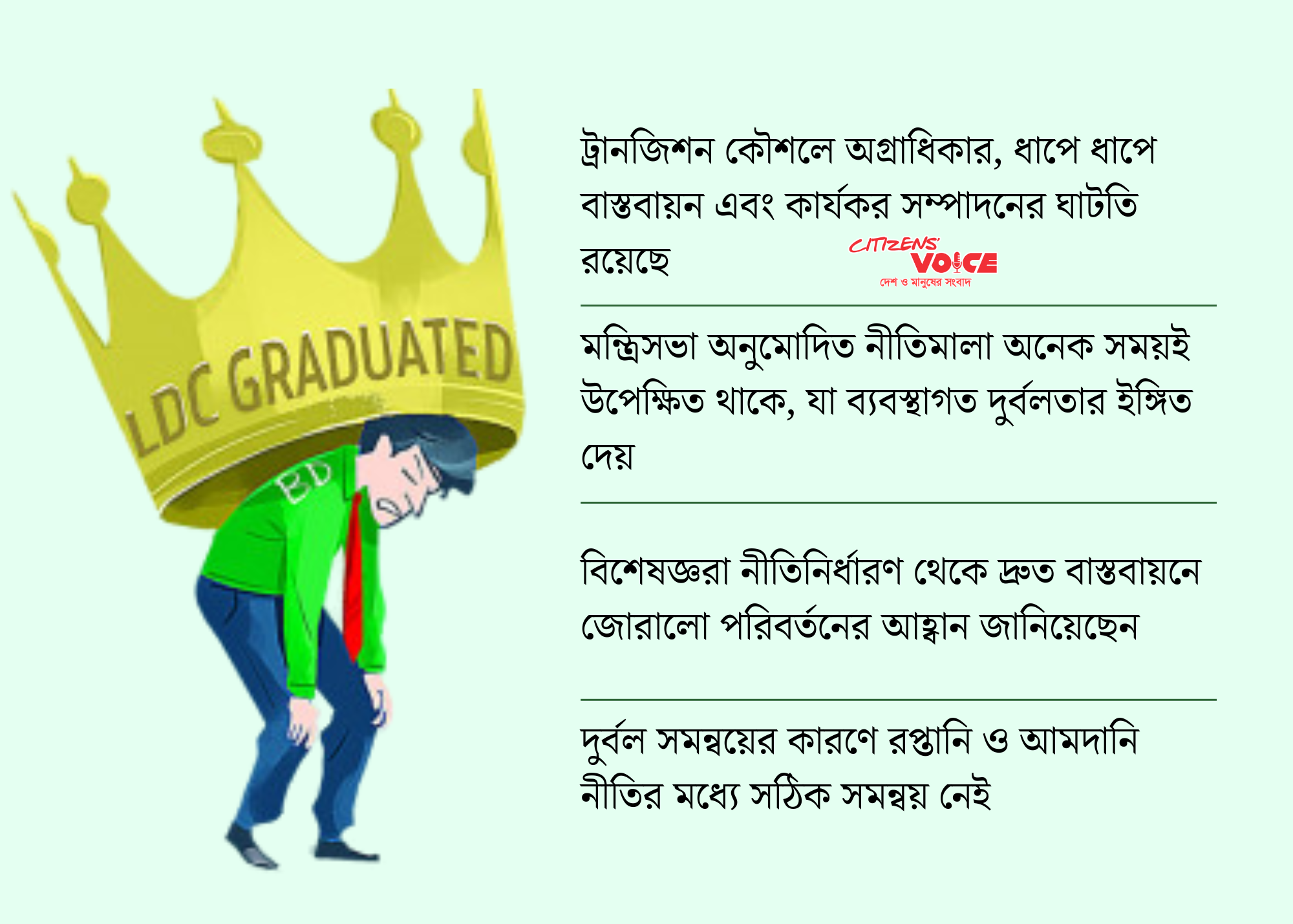 নীতি প্রণয়ন ও বাস্তবায়নের মধ্যকার দূরত্বই এখন বাংলাদেশের অর্থনৈতিক সংস্কার প্রক্রিয়ার বড় চ্যালেঞ্জ হয়ে দাঁড়িয়েছে বলে মন্তব্য করেছেন নীতিনির্ধারক, অর্থনীতিবিদ এবং উন্নয়ন সহযোগীরা। তাদের মতে, স্বল্পোন্নত দেশ (এলডিসি) থেকে উত্তরণের প্রস্তুতির সময় এই ব্যবধান আরও স্পষ্টভাবে সামনে আসছে।