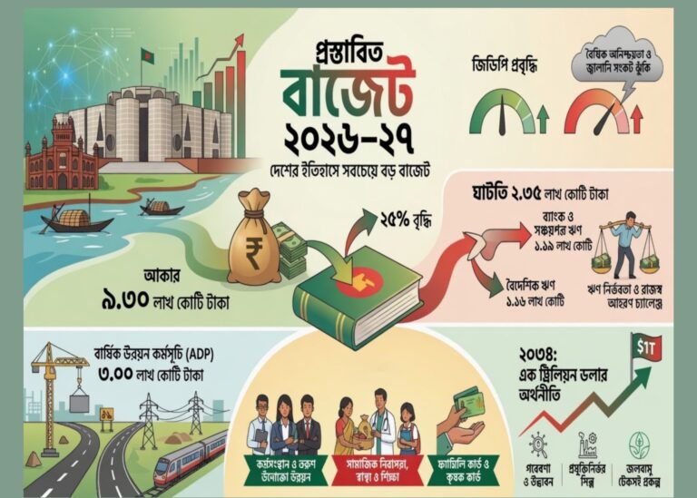 সব মিলিয়ে নতুন বাজেট একদিকে যেমন উচ্চাভিলাষী প্রবৃদ্ধি ও উন্নয়ন লক্ষ্যমাত্রা সামনে রেখেছে, অন্যদিকে ঋণ নির্ভরতা, রাজস্ব আহরণ ও বৈশ্বিক অর্থনৈতিক অনিশ্চয়তা বড় চ্যালেঞ্জ হিসেবে সামনে এসে দাঁড়াচ্ছে।