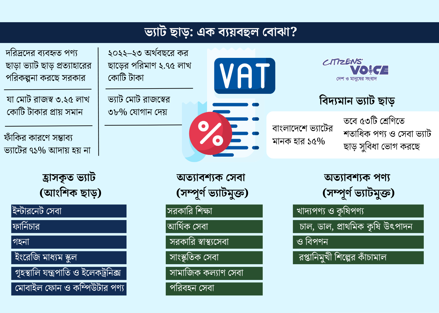 বর্তমানে দেশে ভ্যাটের মান হার ১৫ শতাংশ। এর নিচে কার্যকর হার থাকলে সেটিকে ভ্যাট অব্যাহতি হিসেবে ধরা হয়। খাদ্য, কৃষি, শিক্ষা, স্বাস্থ্য, পরিবহনসহ মোট ৫৩টি ক্যাটাগরির আওতায় শত শত পণ্য ও সেবায় সম্পূর্ণ ভ্যাট অব্যাহতি রয়েছে। এর বাইরে বিভিন্ন সামাজিক, সাংস্কৃতিক, আর্থিক ও পরিবহন সেবাসহ আরও কয়েকটি খাতে আংশিক ভ্যাট ছাড় দেওয়া হয়। এছাড়া রপ্তানি শিল্প, অর্থনৈতিক অঞ্চল, ইপিজেড ও হাইটেক পার্কসহ বিভিন্ন ক্ষেত্রে কর সুবিধা রয়েছে। বাংলাদেশ পরিসংখ্যান ব্যুরোর তথ্যমতে, দেশের জনসংখ্যা প্রায় ১৭ কোটি। এর মধ্যে দরিদ্রতম ৪০ শতাংশের সংখ্যা প্রায় ৬ কোটি ৮০ লাখ।