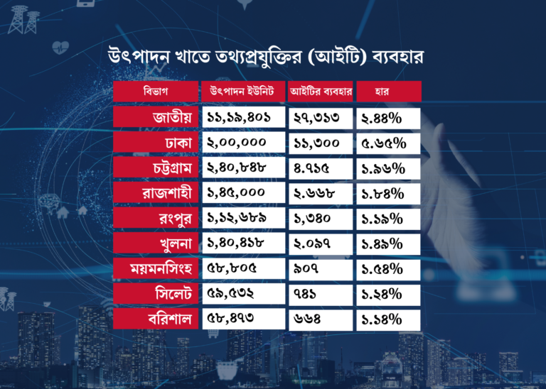 অন্যান্য বিভাগগুলোর অবস্থাও খুব শক্তিশালী নয়। রাজশাহীতে ১ দশমিক ৮৪ শতাংশ, রংপুরে ১ দশমিক ১৯ শতাংশ, খুলনায় ১ দশমিক ৪৯ শতাংশ, ময়মনসিংহে ১ দশমিক ৫৪ শতাংশ এবং সিলেটে ১ দশমিক ২৪ শতাংশ ইউনিট তথ্যপ্রযুক্তি ব্যবহার করছে। সবচেয়ে পিছিয়ে বরিশাল, যেখানে এ হার মাত্র ১ দশমিক ১৪ শতাংশ।