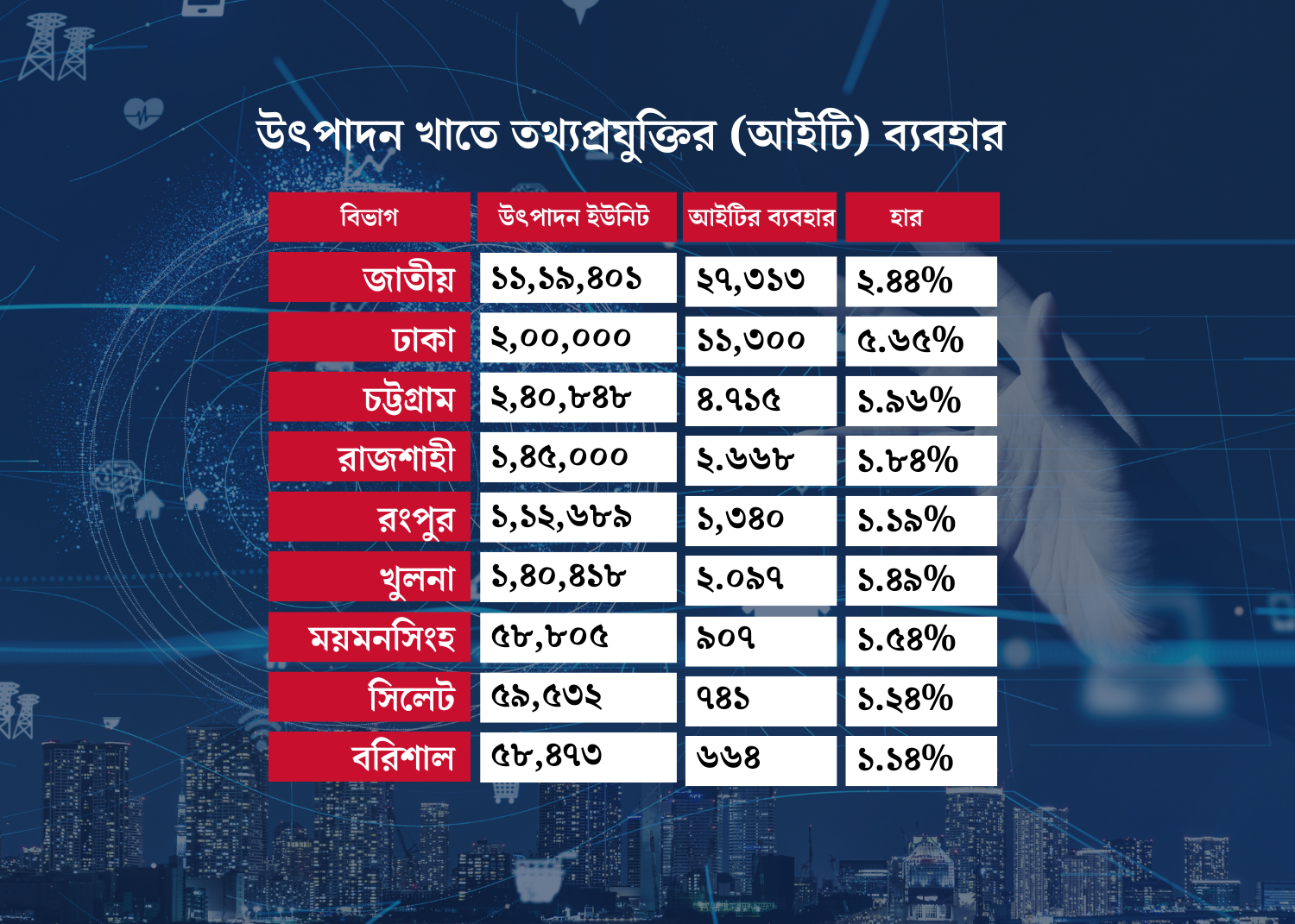 তবে এই বড় শিল্পভিত্তি থাকা সত্ত্বেও প্রযুক্তিগত অগ্রগতিতে চট্টগ্রামের অবস্থান দুর্বল। শুমারি বলছে, চট্টগ্রামের উৎপাদন খাতে ২ লাখ ৪০ হাজার ৮৪৮টি ইউনিটের মধ্যে মাত্র ৪ হাজার ৭১৫টি ইউনিট তথ্যপ্রযুক্তি ব্যবহার করছে। শতাংশের হিসাবে এটি মাত্র ১ দশমিক ৯৬ শতাংশ। ঢাকা বিভাগে এ হার তুলনামূলক বেশি। সেখানে ২ লাখ ইউনিটের মধ্যে ১১ হাজার ৩০০টি ইউনিট তথ্যপ্রযুক্তি ব্যবহারের আওতায় এসেছে, যা মোটের ৫ দশমিক ৬৫ শতাংশ।