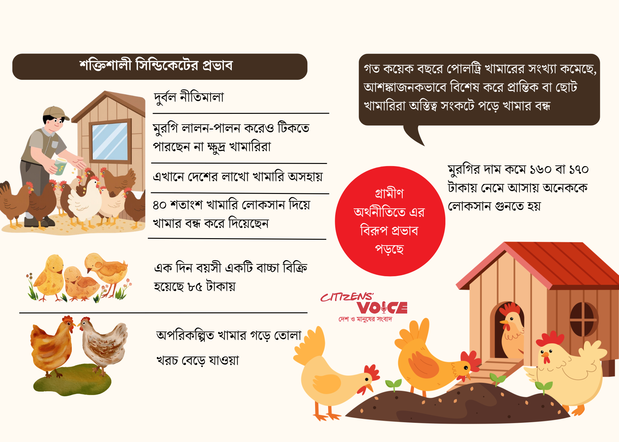 পোলট্রি খাত দেশের গ্রামীণ অর্থনীতির একটি বড় অংশ হলেও বাজার নিয়ন্ত্রণ, উচ্চ খরচ এবং নীতিগত দুর্বলতার কারণে ক্ষুদ্র উদ্যোক্তারা দিন দিন পিছিয়ে পড়ছেন। বিশেষজ্ঞদের মতে, সমন্বিত নীতি না নিলে এই খাতে বড় ধরনের সংকট আরও গভীর হবে।