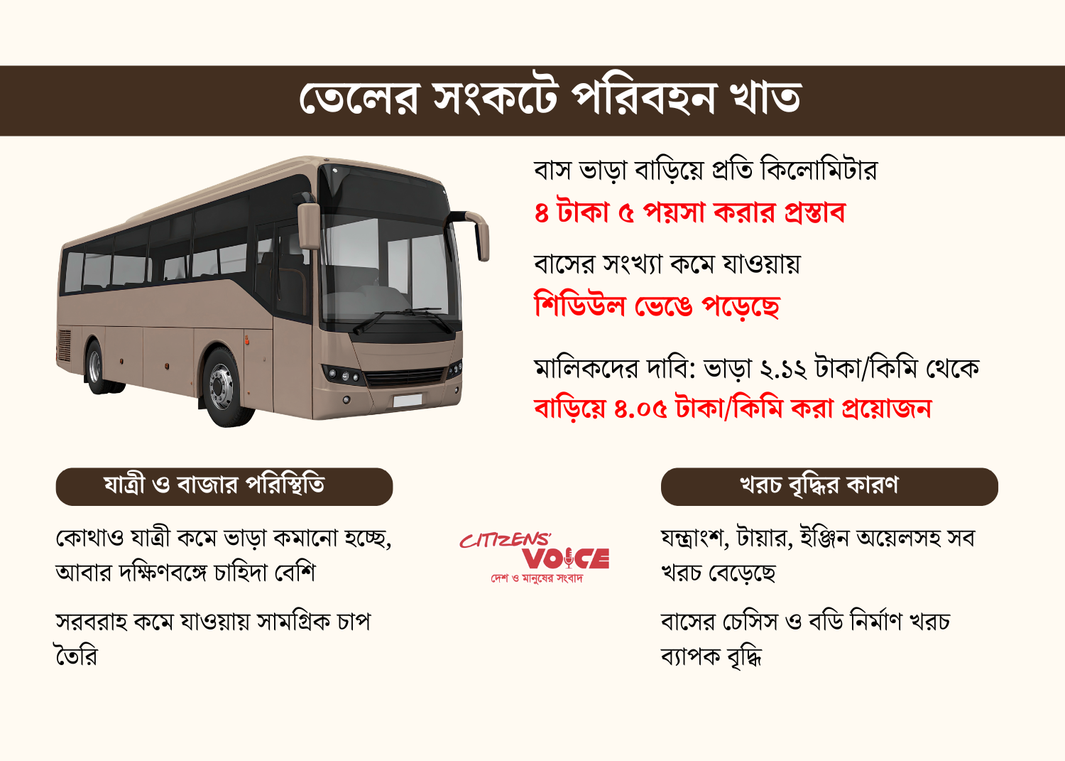 এ পরিস্থিতিতে পরিবহন খাতে দ্বৈত চাপ তৈরি হয়েছে। একদিকে জ্বালানির সীমিত সরবরাহে পরিবহন সক্ষমতা কমছে, অন্যদিকে পরিচালন ব্যয় বাড়ায় ভাড়া বৃদ্ধির চাপ তৈরি হচ্ছে। ফলে যাত্রীদের খরচ বাড়ছে, আর মালিকদের ঝুঁকিও বাড়ছে। রবি পরিবহনের কর্মকর্তা রাকিবুল ইসলাম আশঙ্কা প্রকাশ করে বলেন, এভাবে চলতে থাকলে শুধু সেবা নয়, প্রতিষ্ঠানের আর্থিক স্থিতিও হুমকির মুখে পড়বে। এমনকি কর্মীদের বেতন দেওয়াও অনিশ্চিত হয়ে পড়তে পারে।
