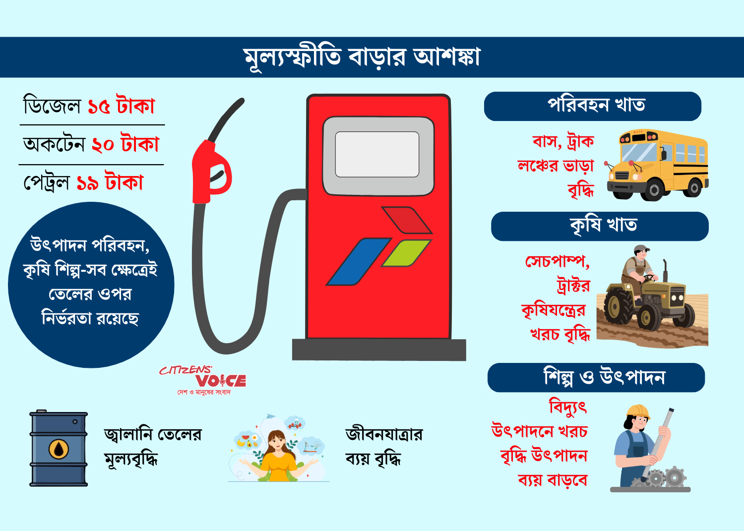 কনজ্যুমার অ্যাসোসিয়েশন অব বাংলাদেশ (ক্যাব) সভাপতি এবং ভোক্তা অধিদপ্তরের সাবেক মহাপরিচালক এ এইচ এম শফিকুজ্জামান মনে করেন, জ্বালানি তেলের মূল্যবৃদ্ধির প্রভাব নতুন করে শুরু হয়নি; বরং এর চাপ আগেই বাজারে প্রতিফলিত হতে শুরু করেছে। তিনি বলেন, তেলের দাম বাড়ানোর আগেই পরিবহন ব্যয় বৃদ্ধি পেয়েছিল, যার সরাসরি প্রভাব নিত্যপ্রয়োজনীয় পণ্যের দামের ওপর পড়ে। এখন নতুন করে দাম বাড়ায় সেই চাপ আরও তীব্র হয়েছে।