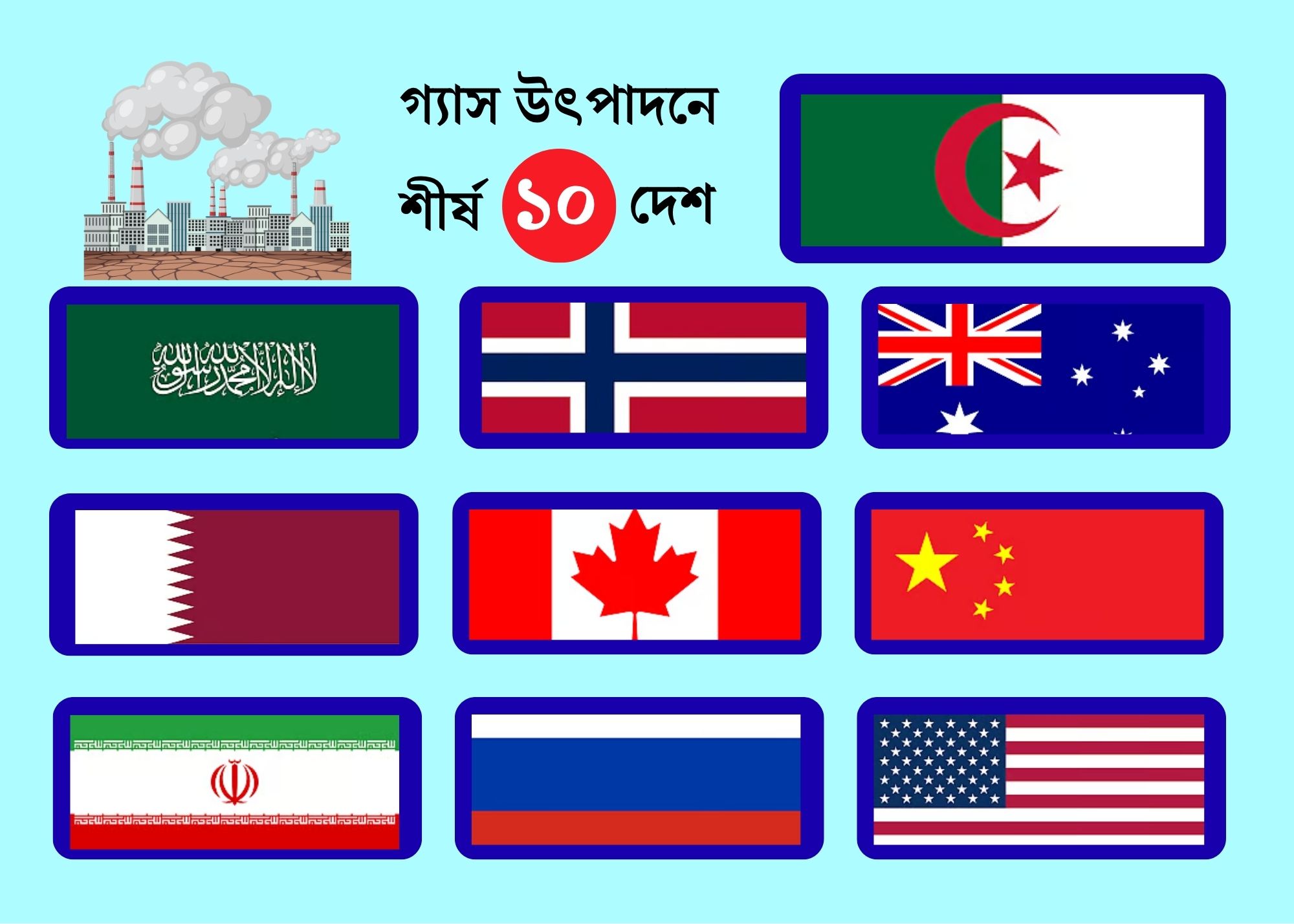যুক্তরাষ্ট্রের জ্বালানি তথ্য প্রশাসন (ইআইএ)-এর সর্বশেষ উপাত্তের ভিত্তিতে তৈরি বৈশ্বিক তালিকায় দেখা যায়, গ্যাস উৎপাদন মূলত কয়েকটি বড় দেশের মধ্যেই সীমাবদ্ধ। তালিকাটি প্রকাশ করেছে ভিজ্যুয়াল ক্যাপিটালিস্ট।