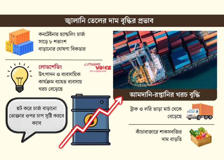 জ্বালানি তেলের মূল্যবৃদ্ধির প্রভাব দেশের আমদানি-রপ্তানি বাণিজ্যে স্পষ্ট হয়ে উঠছে। বিশেষ করে লজিস্টিকস খাতে ব্যয় বেড়ে যাওয়ায় কন্টেইনার পরিচালনায় নতুন করে চার্জ বাড়ানো হয়েছে, যা ব্যবসা ও ভোক্তা—দুই পক্ষের ওপরই চাপ তৈরি করছে।