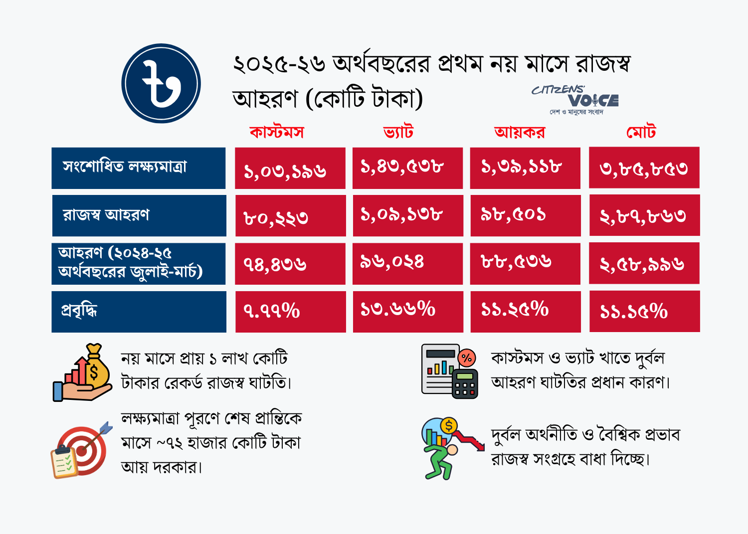 জাতীয় রাজস্ব বোর্ড (এনবিআর) চলতি ২০২৫–২৬ অর্থবছরের প্রথম নয় মাসেই ইতিহাসের অন্যতম বড় রাজস্ব ঘাটতির মুখে পড়েছে। শুল্ক, ভ্যাট ও আয়কর—সব মিলিয়ে এ সময় ঘাটতির পরিমাণ প্রায় ১ লাখ কোটি টাকার কাছাকাছি পৌঁছেছে। যা দেশের রাজস্ব ব্যবস্থাপনার ইতিহাসে এখন পর্যন্ত সর্বোচ্চ বলে বিবেচিত হচ্ছে।