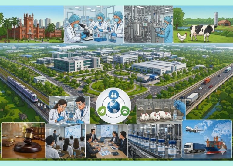 অন্যদিকে প্রাণিসম্পদ খাতে কিছু ক্লাসিক্যাল টিকা উৎপাদিত হলেও তা মূলত মহাখালীর প্রাণিসম্পদ গবেষণা ইনস্টিটিউটের পুরোনো ও সীমিত অবকাঠামোর ওপর নির্ভরশীল। এ প্রেক্ষাপটে ইতিবাচক দিক হলো, মৎস্য ও প্রাণিসম্পদ মন্ত্রণালয় একটি সমন্বিত প্রিক্লিনিক্যাল ট্রায়াল সুবিধা—অ্যানিমেল হাউস—স্থাপনের প্রাথমিক প্রকল্প প্রস্তাব অনুমোদন করেছে। এই সুবিধা মানব ও প্রাণী উভয় খাতে টিকা, থেরাপিউটিকস এবং ডায়াগনস্টিক উন্নয়নে গুরুত্বপূর্ণ ভূমিকা রাখতে পারে। তবে এই অবকাঠামো কোথায় এবং কীভাবে গড়ে উঠবে, তা অত্যন্ত গুরুত্বপূর্ণ। এর অবস্থান ও নকশা নির্ধারণ করবে বাংলাদেশ কতটা কার্যকরভাবে ‘ওয়ান হেলথ’ ভিত্তিক বায়োসিকিউরিটি কাঠামো গড়ে তুলতে পারবে।