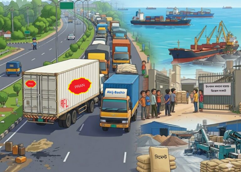 জ্বালানি সংকটের কারণে শুধু পরিবহনই নয়, পুরো সরবরাহ ব্যবস্থা অস্থির হয়ে উঠেছে। এর ফলে পণ্য পৌঁছাতে দেরি হচ্ছে, খরচ বাড়ছে এবং নগদ অর্থ প্রবাহও সংকুচিত হচ্ছে—যা ব্যবসার স্বাভাবিক কার্যক্রমে বড় চাপ তৈরি করছে। আকিজবশির গ্রুপের উপ-ব্যবস্থাপনা পরিচালক মোহাম্মদ খোরশেদ আলম জানান, বর্তমান পরিস্থিতিতে পণ্য পরিবহন এখন প্রায় দুঃস্বপ্নের মতো হয়ে দাঁড়িয়েছে। তিনি বলেন, ১৫ শতাংশ বাড়তি ভাড়া দেওয়ার প্রস্তাব দিলেও ট্রাক পাওয়া যাচ্ছে না।