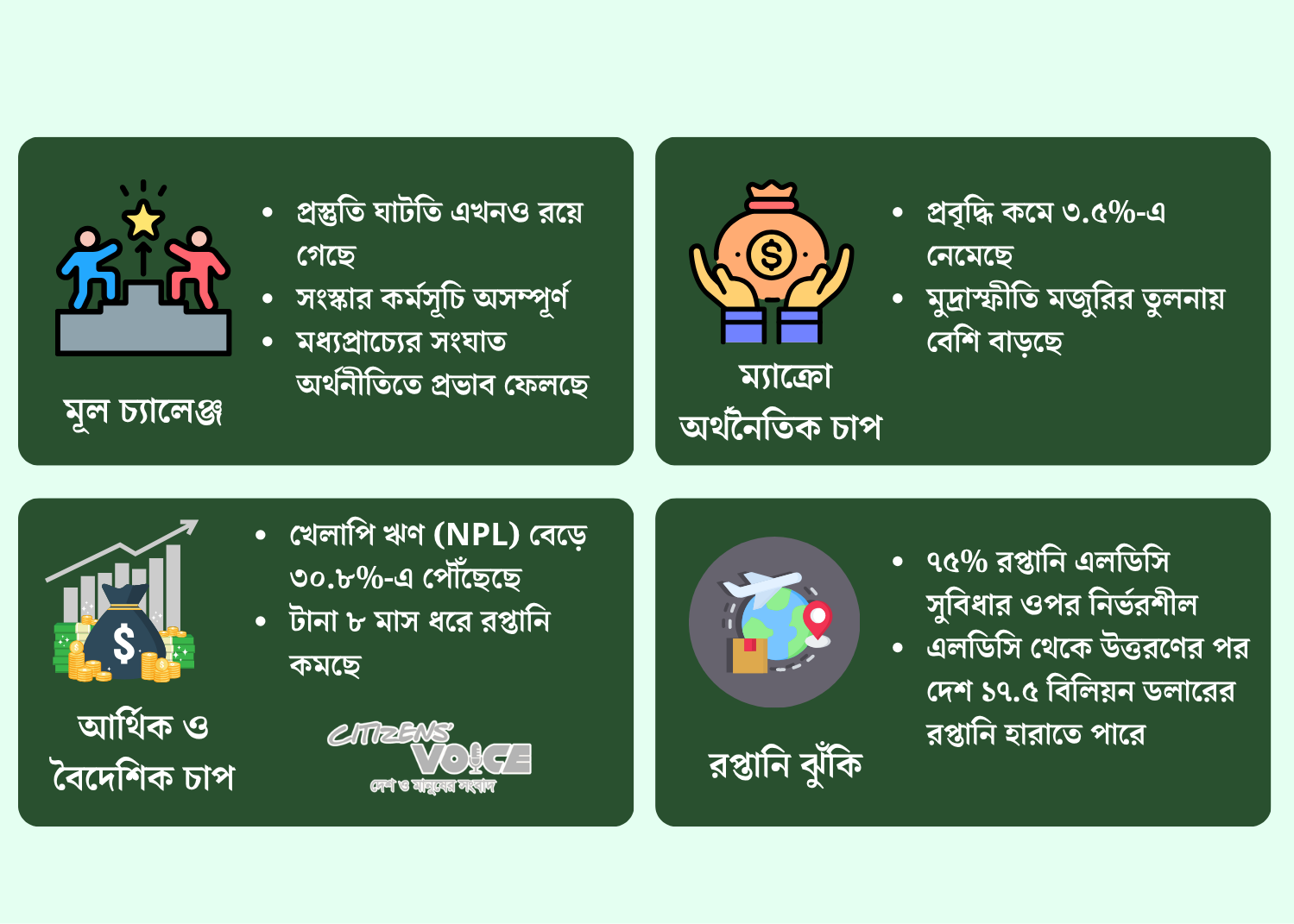অর্থনৈতিক খাতে অনাদায়ী ঋণের হার বেড়ে দাঁড়িয়েছে ৩০.৮ শতাংশে। রাজস্ব-জিডিপি অনুপাত মাত্র ৬.৮ শতাংশ, আর ঋণের সুদ পরিশোধে ব্যয় হচ্ছে কর রাজস্বের ৩৬ শতাংশ। রপ্তানি টানা আট মাস ধরে কমছে। বৈশ্বিক বাণিজ্য অস্থিরতা ও যুক্তরাষ্ট্রের শুল্ক নীতিও চাপ বাড়াচ্ছে। জাতিসংঘের এক মূল্যায়নে বলা হয়েছে, এলডিসি সুবিধা হারালে বাংলাদেশ বছরে ১৭.৫ বিলিয়ন ডলারের বেশি রপ্তানি ক্ষতির মুখে পড়তে পারে।