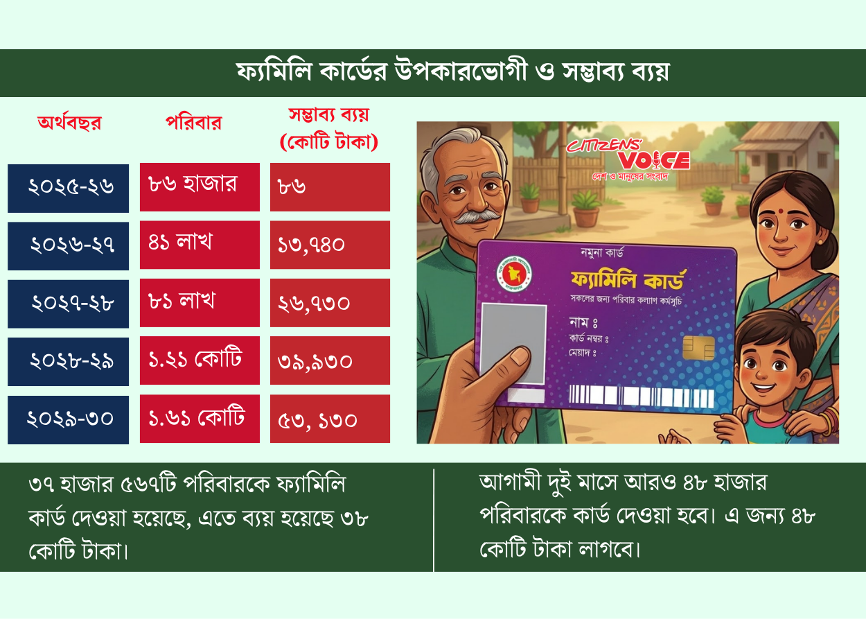 বিশেষজ্ঞরা আরও বলছেন, উপকারভোগী নির্বাচন সঠিক না হলে প্রকল্পের লক্ষ্য পূরণ নাও হতে পারে। তাই স্বচ্ছতা ও তথ্য যাচাই প্রক্রিয়াকে সবচেয়ে গুরুত্ব দিতে হবে। সব মিলিয়ে, ফ্যামিলি কার্ড কর্মসূচি সরকারের সামাজিক সুরক্ষা খাতে একটি বড় উদ্যোগ হিসেবে দেখা হচ্ছে। তবে এর সাফল্য নির্ভর করবে সঠিক বাস্তবায়ন, অর্থ ব্যবস্থাপনা এবং কার্যকর তদারকির ওপর।