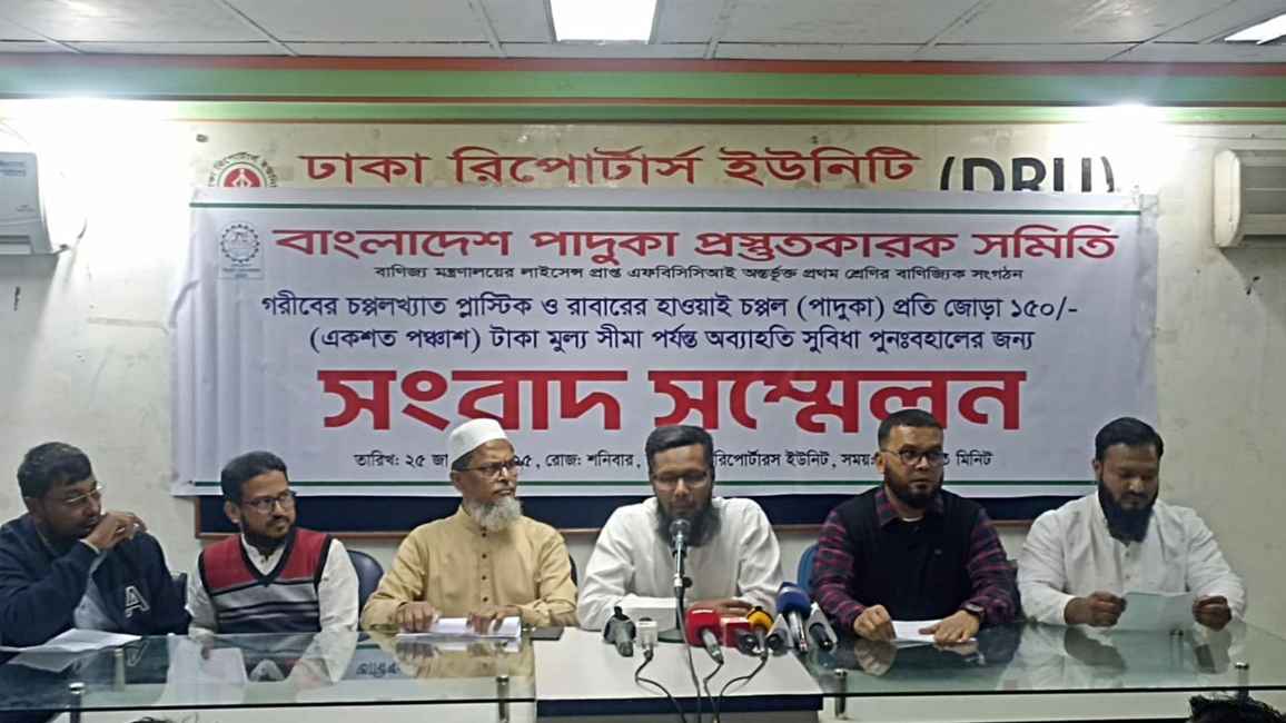 সংবাদ সম্মেলনে আরও উপস্থিত ছিলেন সমিতির সহসভাপতি আশরাফ উদ্দিন, সচিব ইমরুল কায়েস এবং সদস্য জাহেরুল ইসলাম। তাঁরা সরকারের প্রতি আহ্বান জানান, জনগণের স্বার্থ ও স্থানীয় শিল্পের বিকাশ বিবেচনায় এনে ১৫০ টাকার নিচে প্লাস্টিক ও রাবারের তৈরি জুতা ও চপ্পলের ওপর আরোপিত ১৫ শতাংশ ভ্যাট দ্রুত প্রত্যাহার করা হোক।