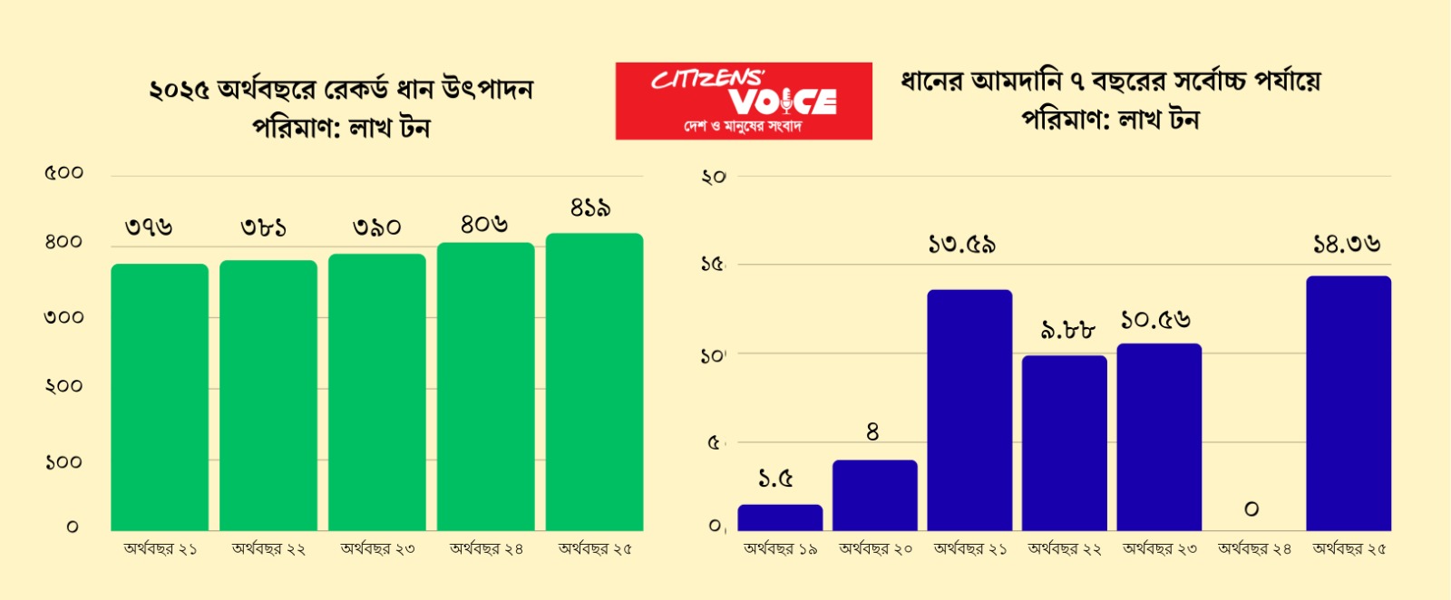এছাড়া, গত বছরের নভেম্বরে আমদানি শুরু হওয়া এবং রেকর্ড ফলনের পরও চালের দাম কমেনি। সরকারের মজুত বৃদ্ধি পেয়ে জুলাইয়ে প্রায় ২০ লাখ টনে পৌঁছেছে। অর্থাৎ, সরবরাহ ও মজুত পর্যাপ্ত থাকলেও বাজারে চাহিদা ও মূল্য সমন্বয় সঠিকভাবে কার্যকর হচ্ছে না।