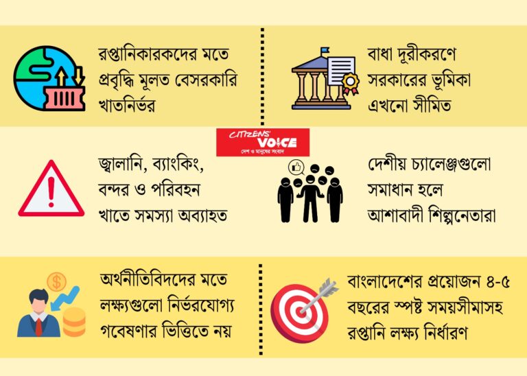 শর্তভিত্তিক আশাবাদ: বাংলাদেশের রপ্তানি খাত নানা প্রতিবন্ধকতা সত্ত্বেও শক্তিশালী সম্ভাবনা রাখে। শিল্প নেতারা মনে করেন, অভ্যন্তরীণ কাঠামোগত সমস্যা সমাধান হলে রপ্তানি লক্ষ্য অর্জন ও তার চেয়েও বেশি অর্জন সম্ভব।