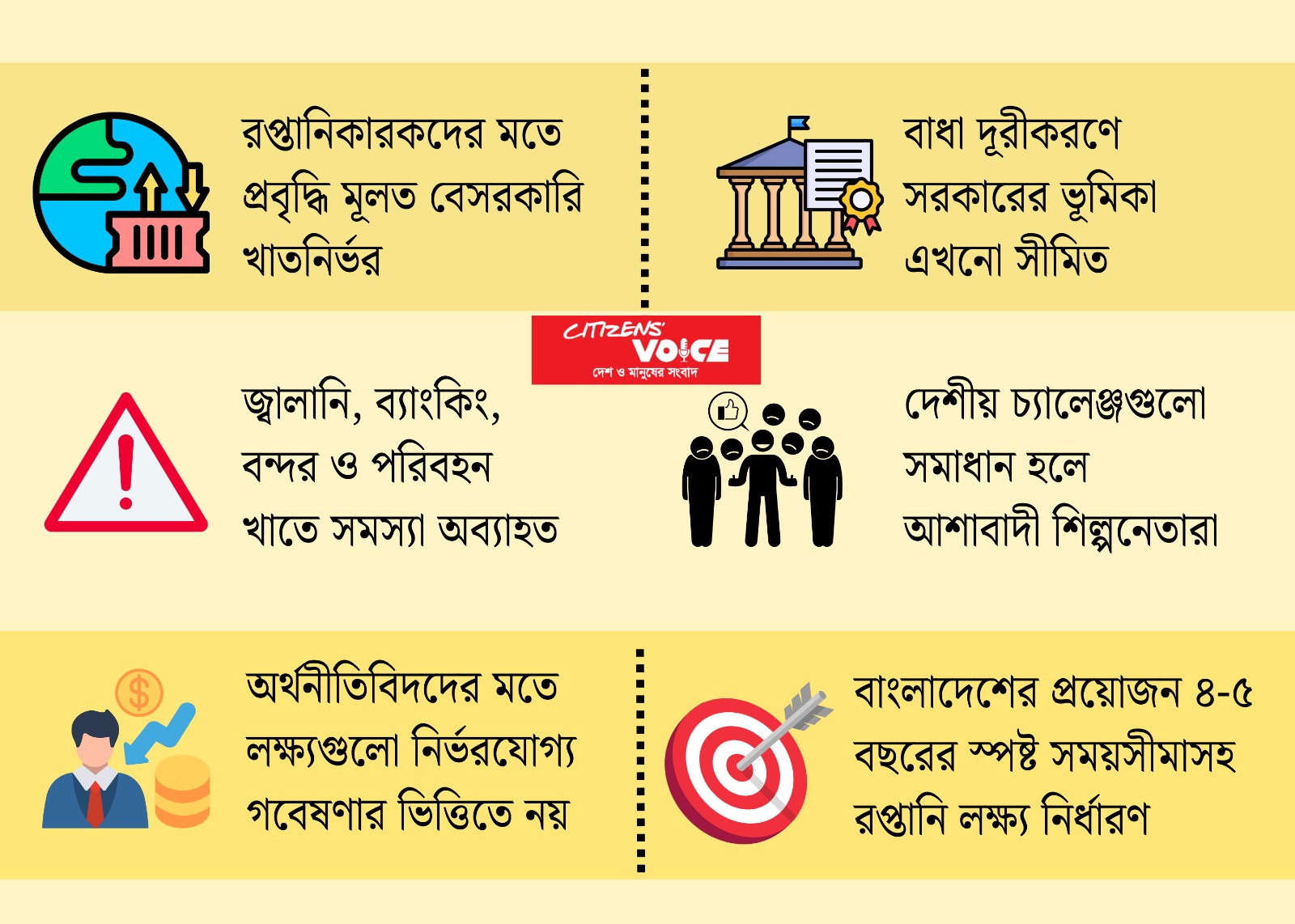 বাংলাদেশ সরকার প্রতি বছর উচ্চাভিলাষী রপ্তানি লক্ষ্য ঘোষণা করে। ২০২৫-২৬ অর্থবছরের জন্য বাণিজ্য মন্ত্রণালয় পণ্য ও সেবা খাত থেকে ৬৩.৫ বিলিয়ন ডলার রপ্তানি আয়ের লক্ষ্যমাত্রা নির্ধারণ করেছে। এটি গত বছরের লক্ষ্যের তুলনায় ১৬.৫ শতাংশ বেশি। ২০২৪-২৫ অর্থবছরে রপ্তানি আগের বছরের তুলনায় ৮.৫ শতাংশ বৃদ্ধি পেয়েছিল, তবে নির্ধারিত লক্ষ্যের চেয়ে তা ৭.৫ শতাংশ কম ছিল।রপ্তানিকারক ও অর্থনীতিবিদরা প্রশ্ন তুলছেন, বছরের পর বছর ধরে চলতে থাকা কাঠামোগত প্রতিবন্ধকতা দূর না করে কীভাবে এই উচ্চাভিলাষী লক্ষ্য পূরণ সম্ভব।
